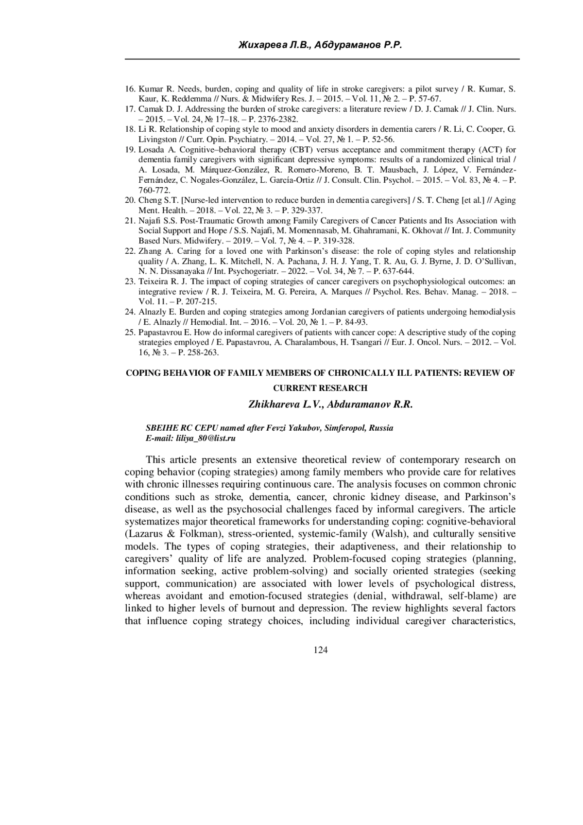 24. Alnazly E. Burden and coping strategies among Jordanian caregivers of patients undergoing hemodialysis / E. Alnazly // Hemodial. Int. - 2016. - Vol. 20, № 1. - P. 84-93.