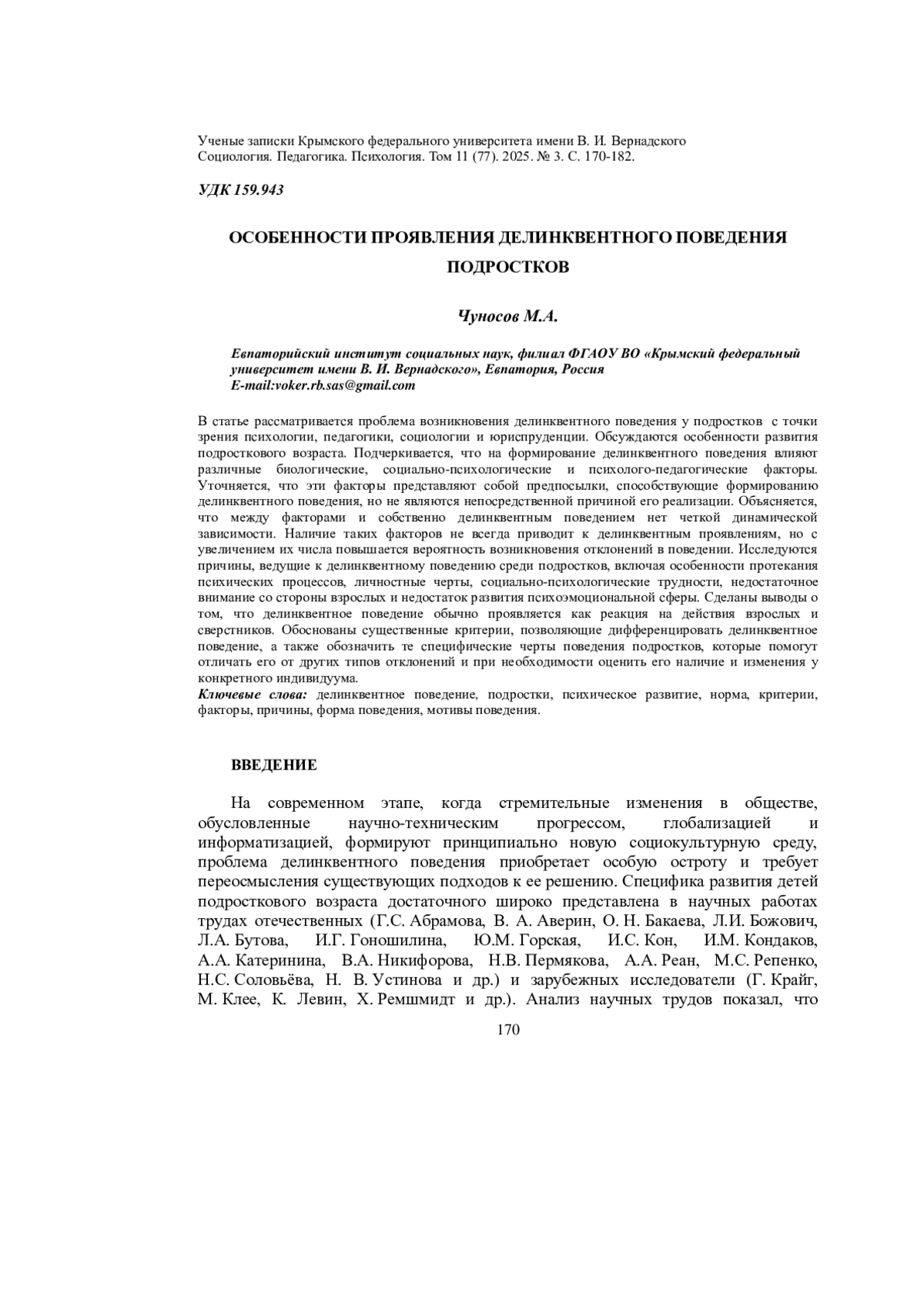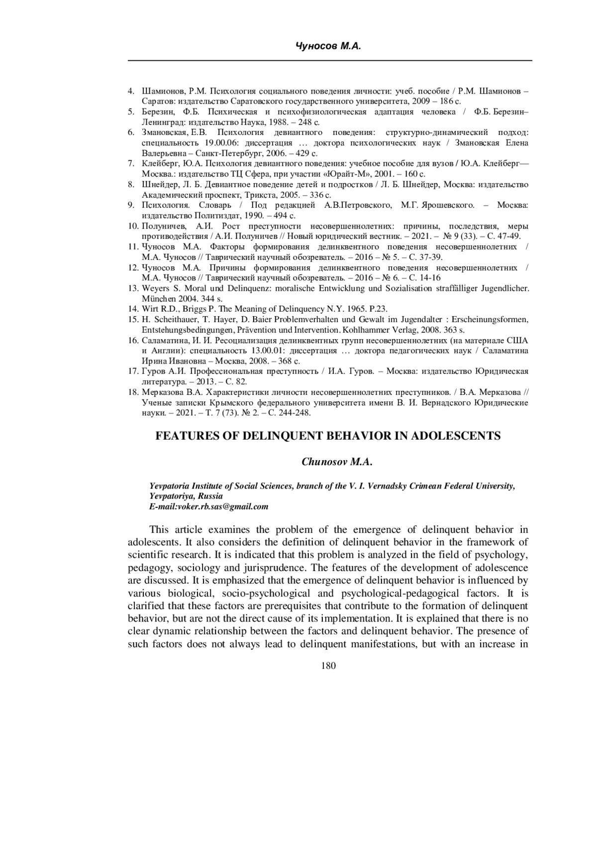 11. Чуносов М.А. Факторы формирования делинквентного поведения несовершеннолетних / М.А. Чуносов // Таврический научный обозреватель. - 2016 - № 5. - С. 37-39. EDN: WCKWBH