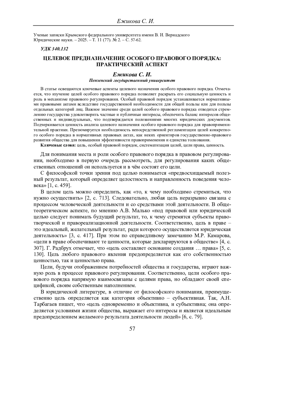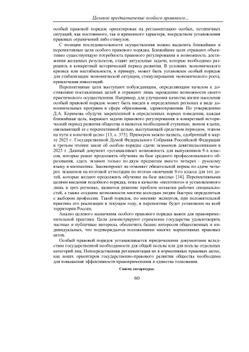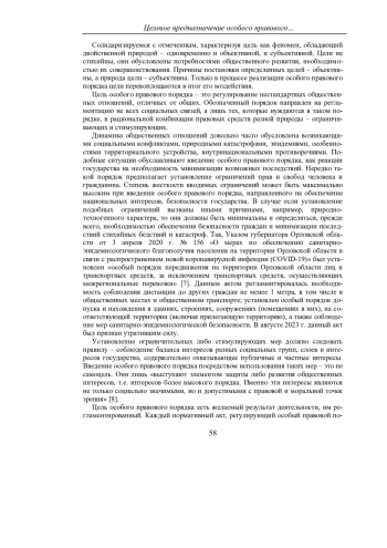 В статье освещаются ключевые аспекты целевого назначения особого правового порядка. Отмечается, что изучение целей особого правового порядка позволяет раскрыть его социальную ценность и роль в механизме правового регулирования. Особый правовой порядок устанавливается нормативными правовыми актами вследствие государственной необходимости для общей пользы или для пользы отдельных категорий лиц. Важное значение среди целей особого правового порядка отводится стремлению государства удовлетворить частные и публичные интересы, обеспечить баланс интересов общественных и индивидуальных, что подтверждается положениями многих юридических документов. Подчеркивается ценность анализа целевого назначения особого правового порядка для правоприменительной практики. Презюмируется необходимость непосредственной регламентации целей конкретного особого порядка в нормативных правовых актах, как неких ориентиров государственно-правового развития общества для повышения эффективности правоприменения и единства толкования.
