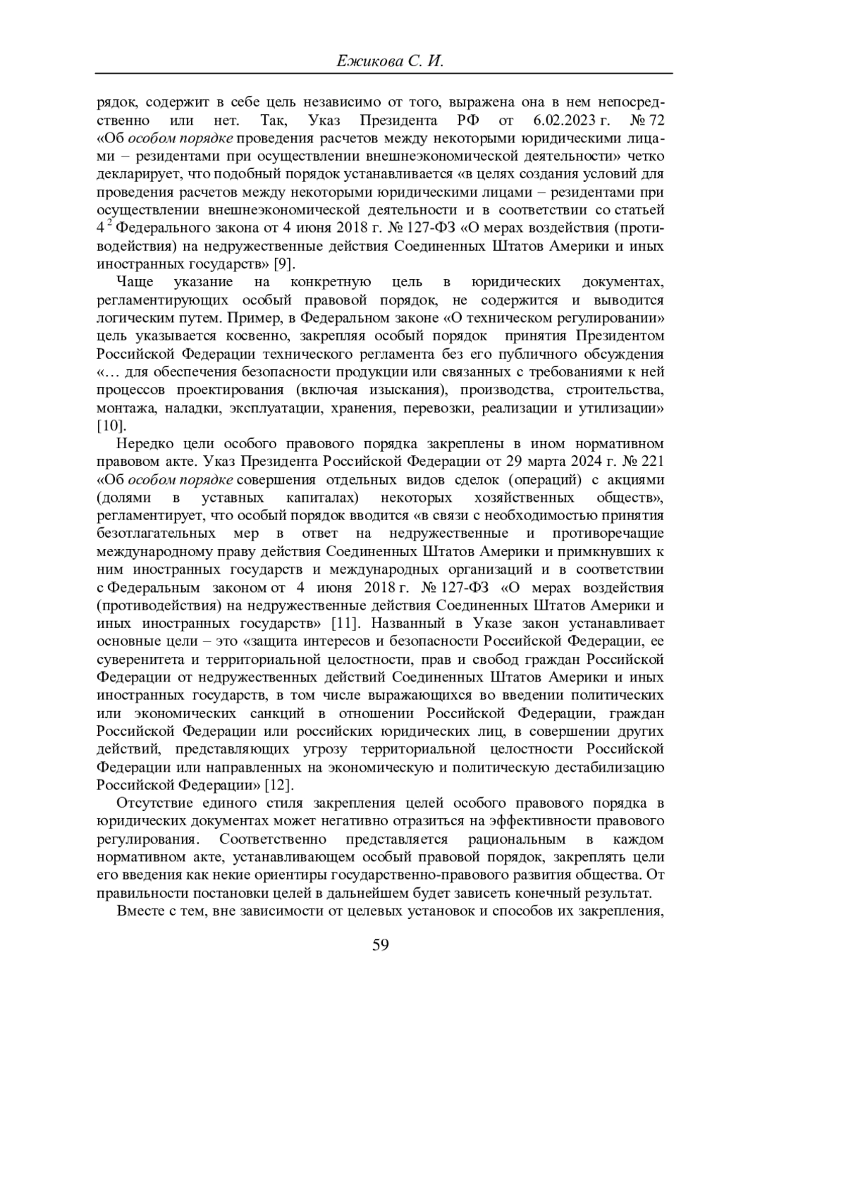 9. Указ Президента РФ от 6 февраля 2023 г. № 72 “Об особом порядке проведения расчетов между некоторыми юридическими лицами - резидентами при осуществлении внешнеэкономической деятельности” // Собрание законодательства РФ. - 2023. - № 7. ст. - 1104.