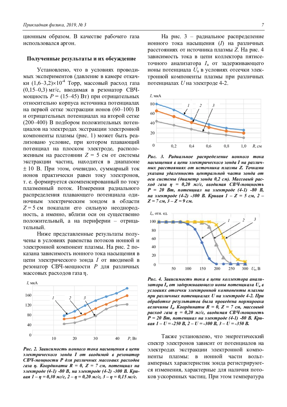 Установлена возможность одновременной экстракции ионной и электронной компонент плазмы и формирование скомпенсированного по току потока плазмы, создаваемой в узком коаксиальном резонаторе на ЭЦР. Представлены характерные зависимости ионного тока от массового расхода газа (аргон) и вводимой в резонатор СВЧ-мощности.