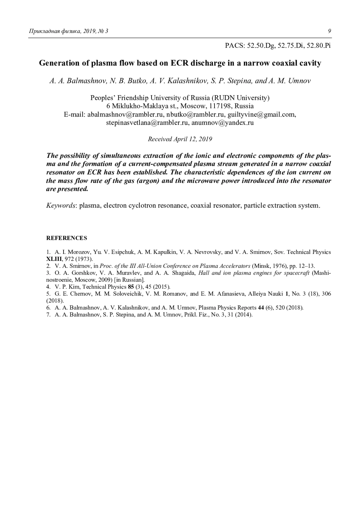 6. A. A. Balmashnov, A. V. Kalashnikov, and A. M. Umnov, Plasma Physics Reports 44 (6), 520 (2018).