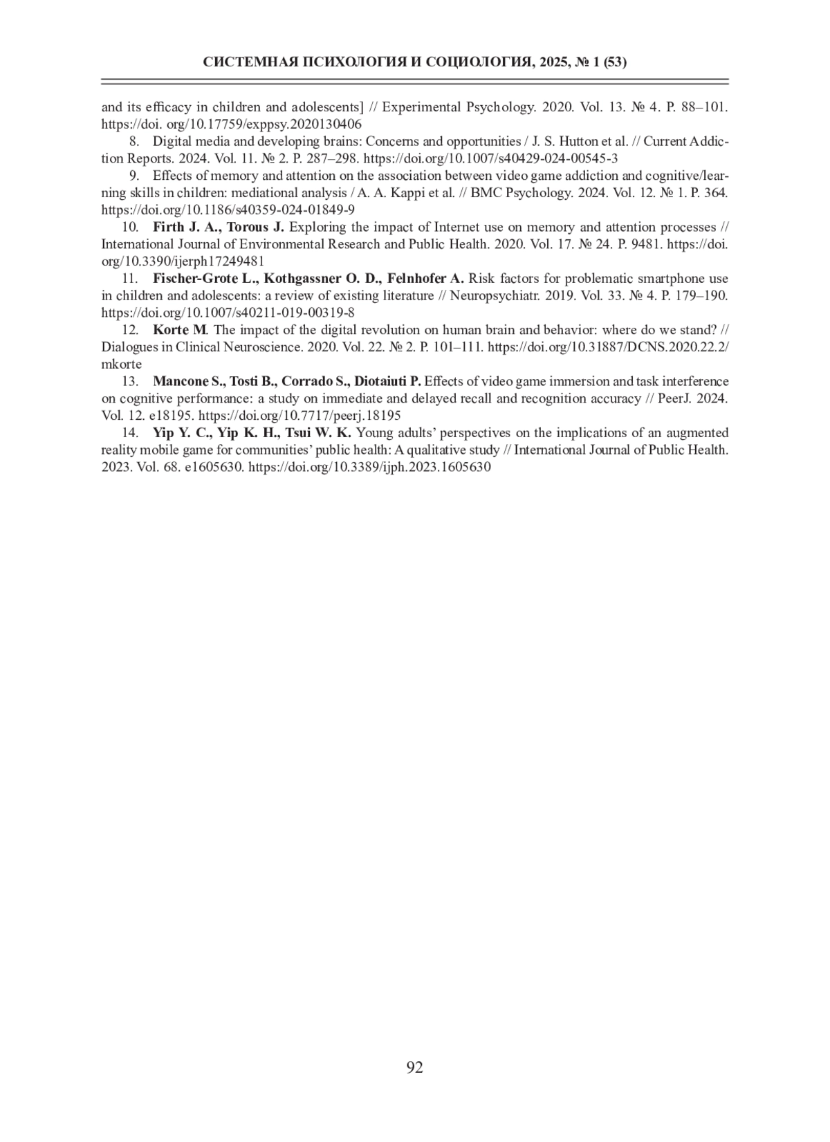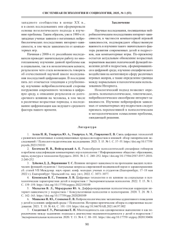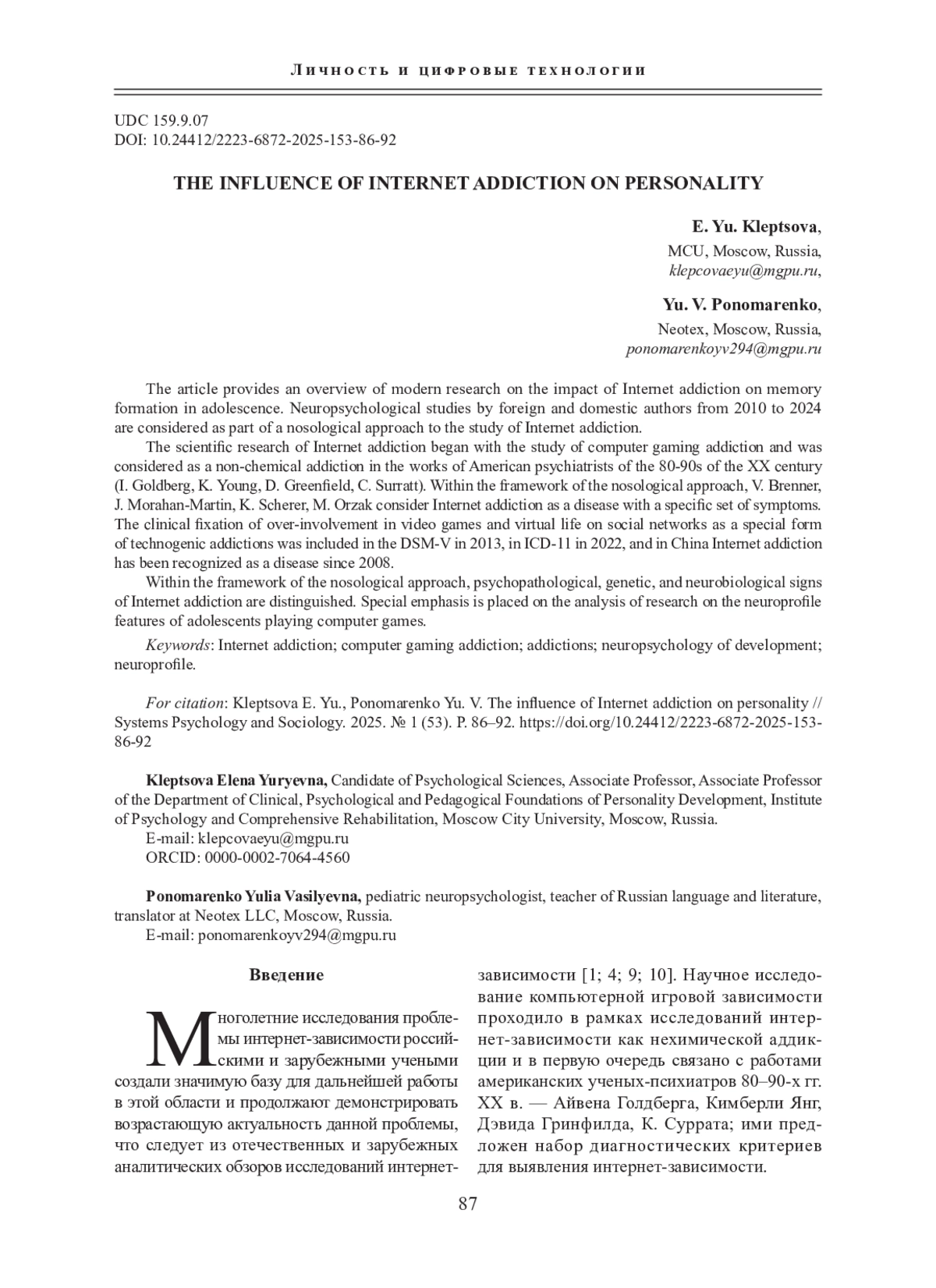 КЛЕПЦОВА Е. Ю., ПОНОМАРЕНКО Ю. В. ВЛИЯНИЕ ИНТЕРНЕТ-ЗАВИСИМОСТИ НА ЛИЧНОСТЬ // СИСТЕМНАЯ ПСИХОЛОГИЯ И СОЦИОЛОГИЯ. 2025. № 1 (53)