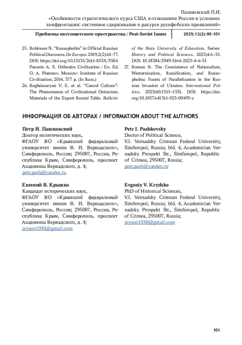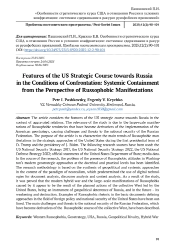 В статье рассматриваются особенности стратегического курса США в отношении России в условиях обострения отношений. Актуальность исследования обусловлена масштабными проявлениями русофобских тенденций, ставших производными реализации американской геостратегии, обусловив вызовы и угрозы национальной безопасности Российской Федерации. Цель статьи – охарактеризовать основные тенденции русофобских проявлений в стратегических подходах Соединённых Штатов в годы первого президентского срока Д. Трампа и президентства Дж. Байдена. В качестве источников исследования были использованы: Стратегия национальной безопасности США 2017 г.; Стратегия национальной безопасности США 2022 г., Стратегия национальной обороны США 2022 г.; официальные заявления Государственного департамента Соединённых Штатов; данные средств массовой информации. В процессе исследования была обозначена проблема наличия русофобских установок в современных геостратегических подходах Вашингтона на доктринальном и практическом уровнях. Методология исследования базируется на синтезе геополитического и системного подходов в контексте парадигмы неореализма, что предопределило применение метода анализа документов, дискурс-анализа и контент-анализа. В результате исследования было обосновано, что современная гибридная война и вызванные ею масштабные проявления русофобии представляются следствием спланированных действий ведомого Соединёнными Штатами коллективного Запада, являясь инструментом геополитического сдерживания России, а в дальнейшем – её ослабления и разрушения. Обозначены примеры русофобской риторики в базовых документах, определяющих подходы в области внешней политики и национальной безопасности США. Охарактеризованы основные вызовы и угрозы национальной безопасности Российской Федерации, ставшие производными русофобского курса коллективного Запада.