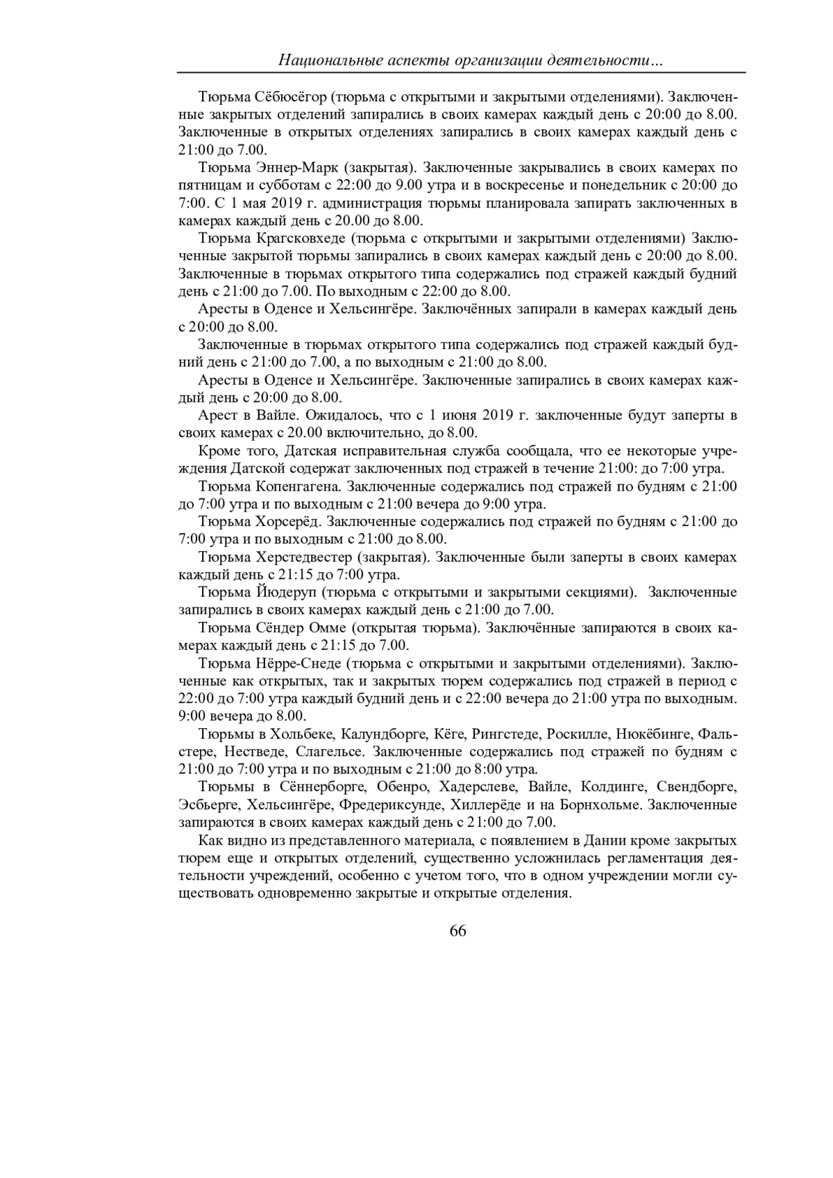 Статья посвящена изучения проблемы возникновения учреждений частичного ограничения свободы в Дании, специфике организации их деятельности, целям и задачам. Рассматриваются вопросы содержания заключенных, их прав и обязанностей; разделение различных групп заключенных, при совместном содержании на основании закона 2019 г. об исполнении наказаний. Выявлено, что при единых базовых права заключенных, государством используются различные подходы к контролю за их деятельностью, свободным временем. Это отображено в том числе, на существующей в различных учреждениях страны регламентации закрытия и открытия камер для осужденных.