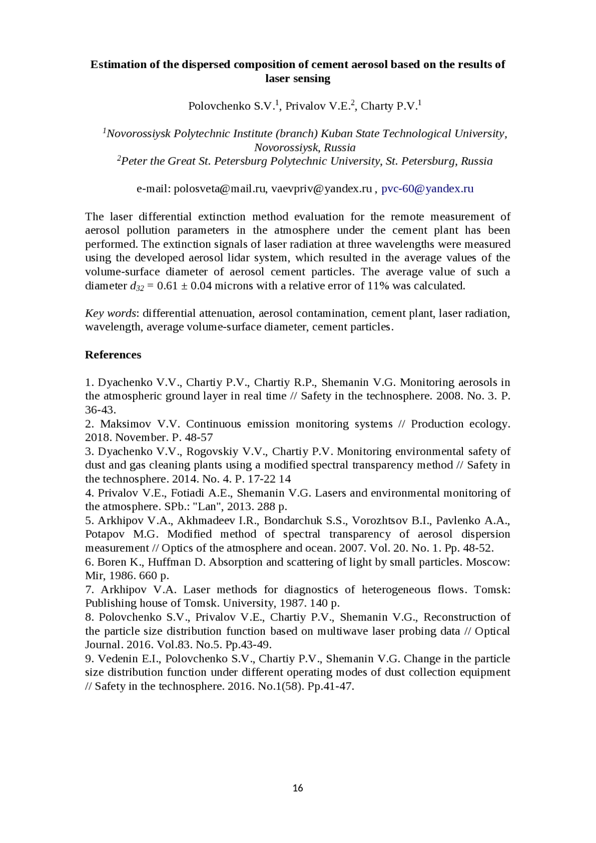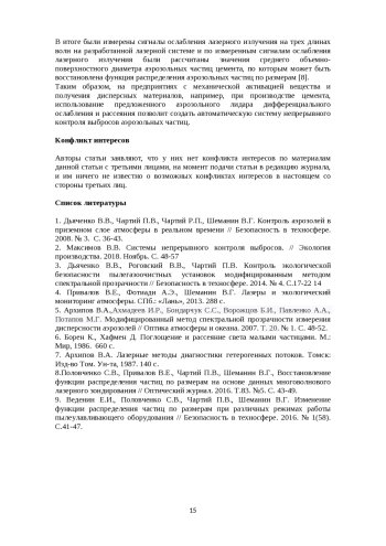 1. Дьяченко В.В., Чартий П.В., Чартий Р.П., Шеманин В.Г. Контроль аэрозолей в приземном слое атмосферы в реальном времени // Безопасность в техносфере. 2008. № 3. С. 36-43.