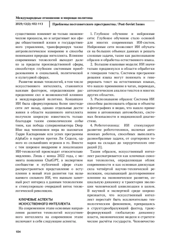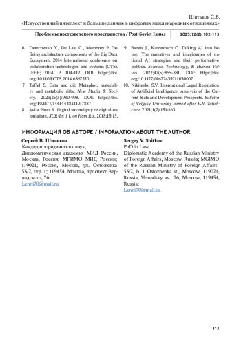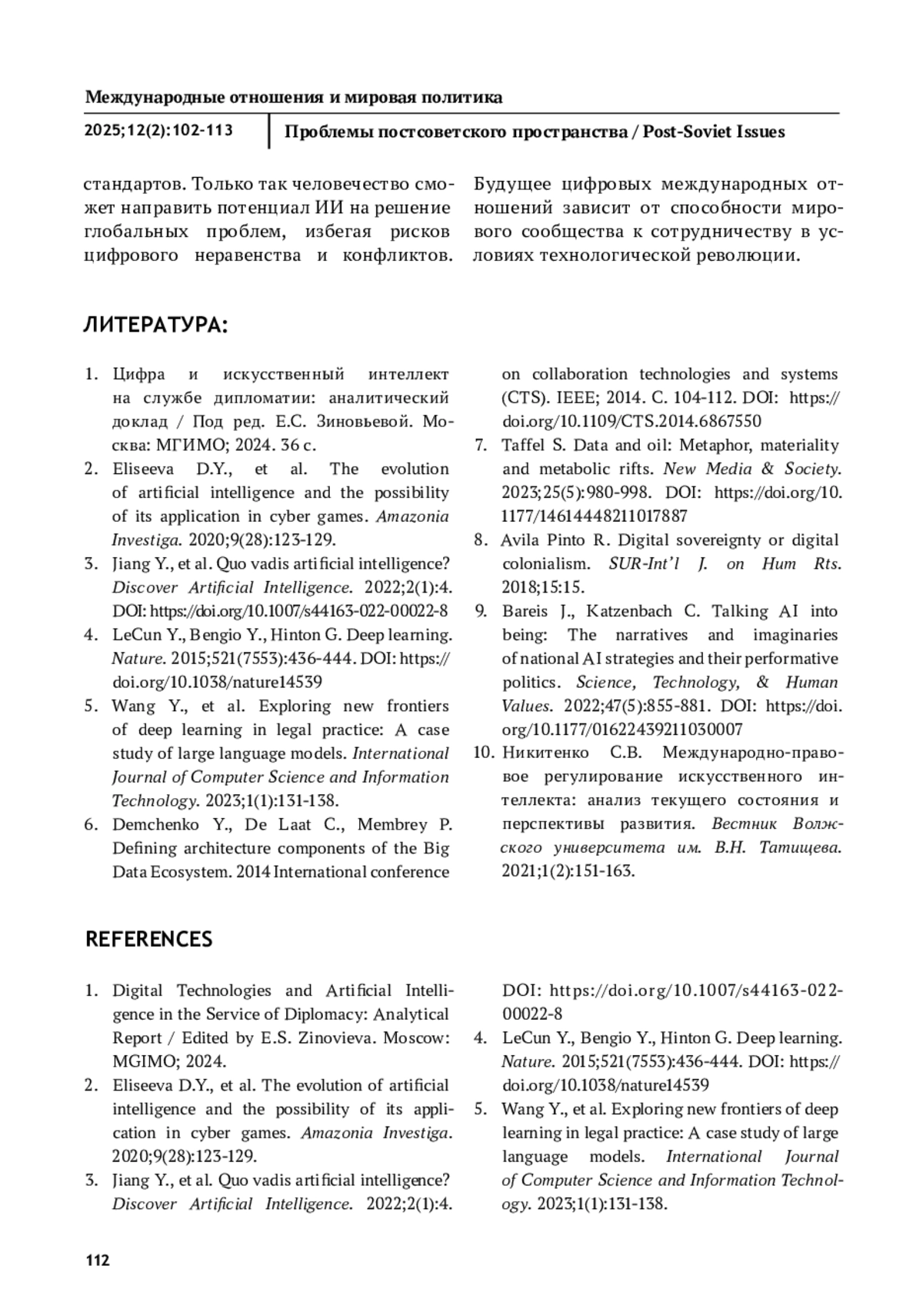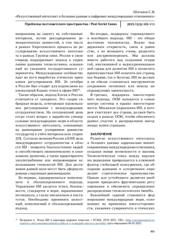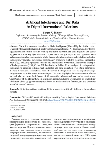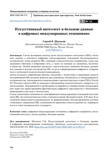 ШИТЬКОВ С. В. ИСКУССТВЕННЫЙ ИНТЕЛЛЕКТ И БОЛЬШИЕ ДАННЫЕ В ЦИФРОВЫХ МЕЖДУНАРОДНЫХ ОТНОШЕНИЯХ // ПРОБЛЕМЫ ПОСТСОВЕТСКОГО ПРОСТРАНСТВА. 2025. ТОМ 12, № 2