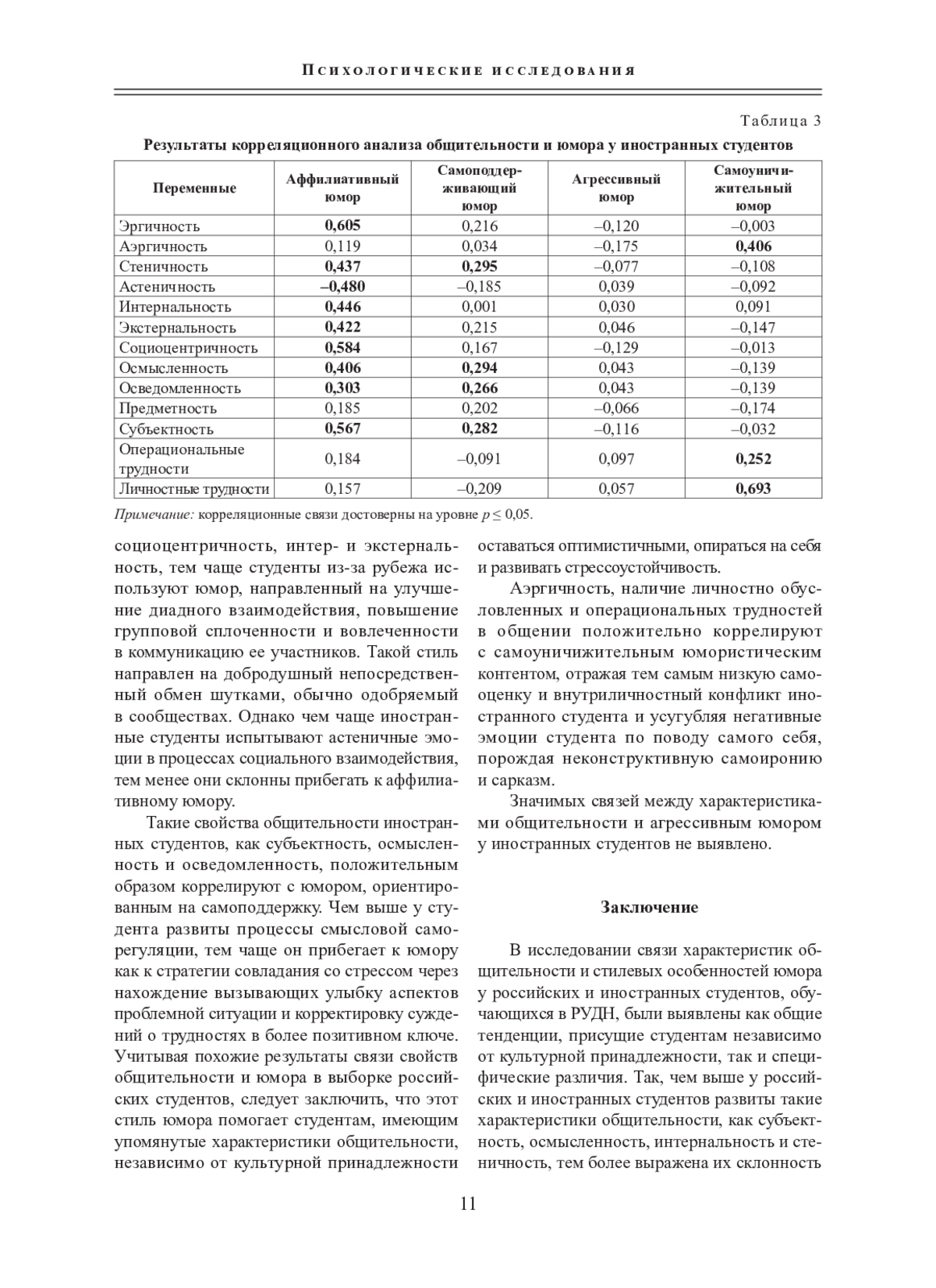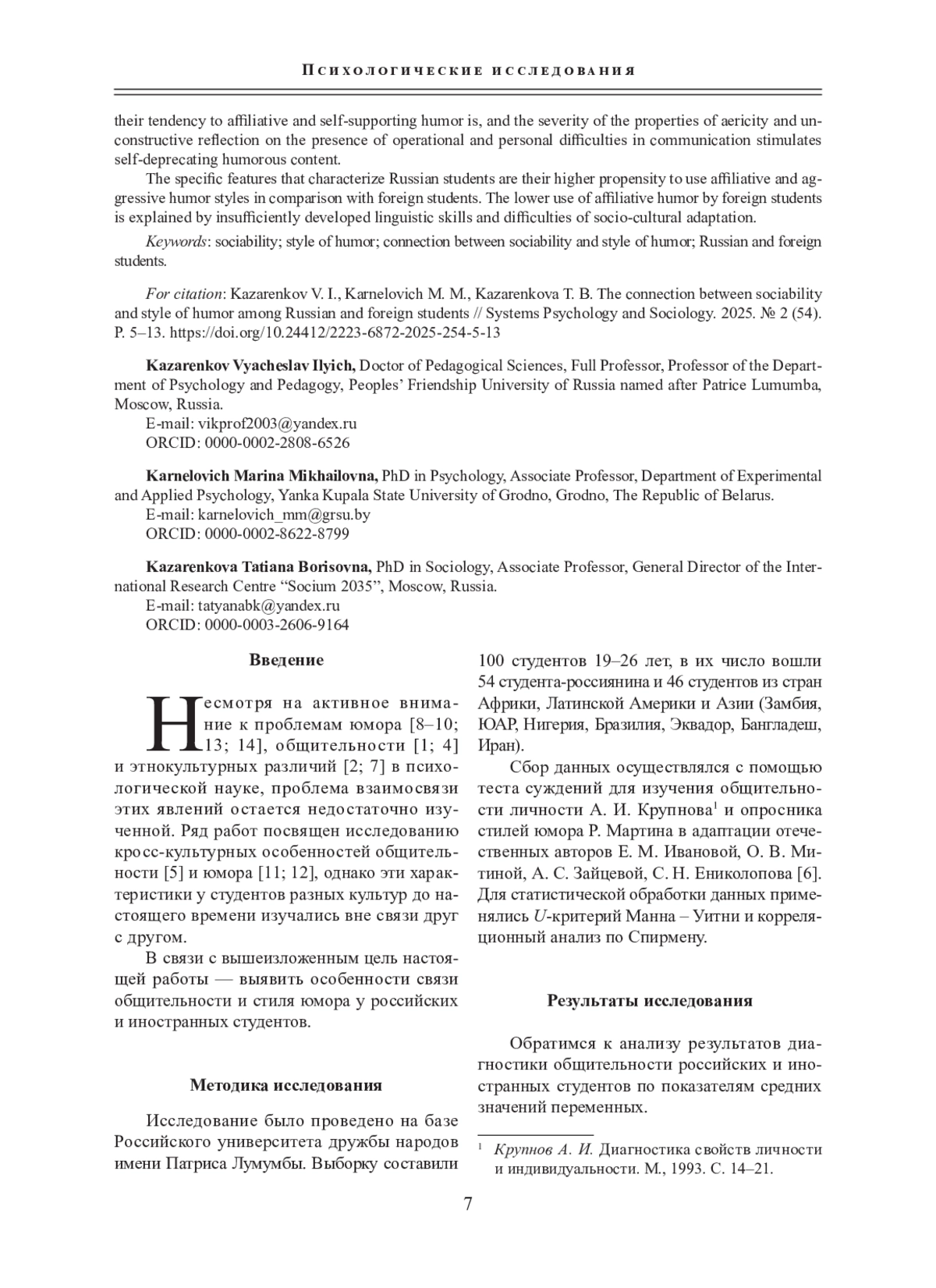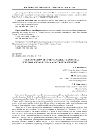 Цель исследования - выявить особенности связи общительности и стиля юмора у российских и иностранных студентов. Исследование проведено на базе РУДН имени П. Лумумбы. Выборку составили 100 студентов 19-26 лет, из них 54 российских студента и 46 студентов из стран Африки, Азии и Латинской Америки. Методами сбора данных являлись тест суждений для изучения общительности личности А. И. Крупнова и опросник стилей юмора Р. Мартина в русскоязычной адаптации. Для статистической обработки данных применялись U -критерий Манна - Уитни и корреляционный анализ по Спирмену. В исследовании выявлены как общие закономерности, так и специфические различия связи общительности и юмора, присущие студентам разных культур. Чем выше у российских и иностранных студентов развиты такие характеристики общительности, как субъектность, осмысленность, интернальность и стеничность, тем более выражена их склонность к аффилиативному и самоподдерживающему юмору, а выраженность свойств аэргичности и неконструктивной рефлексии о наличии операциональных и личностных трудностей в коммуникации стимулирует самоуничижительный юмористический контент.