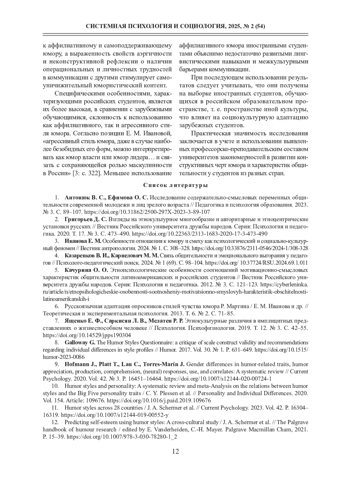 1. Антонюк В. С., Ефимова О. С. Исследование содержательно-смысловых переменных общительности современной молодежи и лиц зрелого возраста // Педагогика и психология образования. 2023. № 3. C. 89-107. DOI: 10.31862/2500-297X-2023-3-89-107 EDN: SYXATR