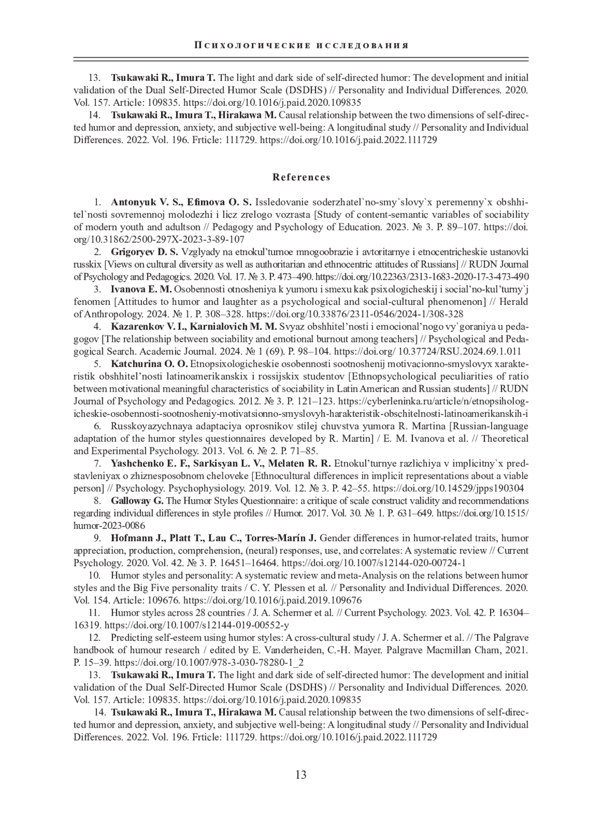 14. Tsukawaki R., Imura T., Hirakawa M. Causal relationship between the two dimensions of self-directed humor and depression, anxiety, and subjective well-being: A longitudinal study // Personality and Individual Differences. 2022. Vol. 196. Frticle: 111729. DOI: 10.1016/j.paid.2022.111729 EDN: AYTNWH