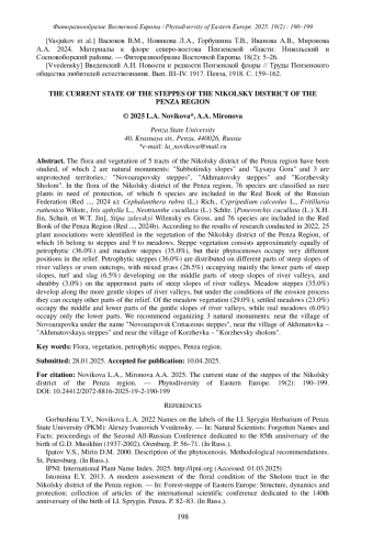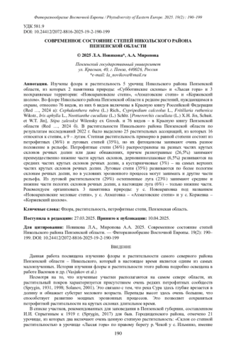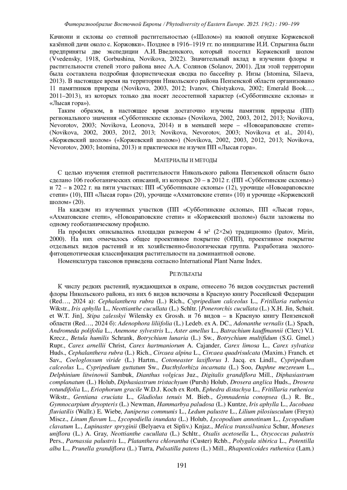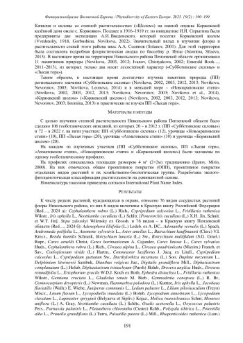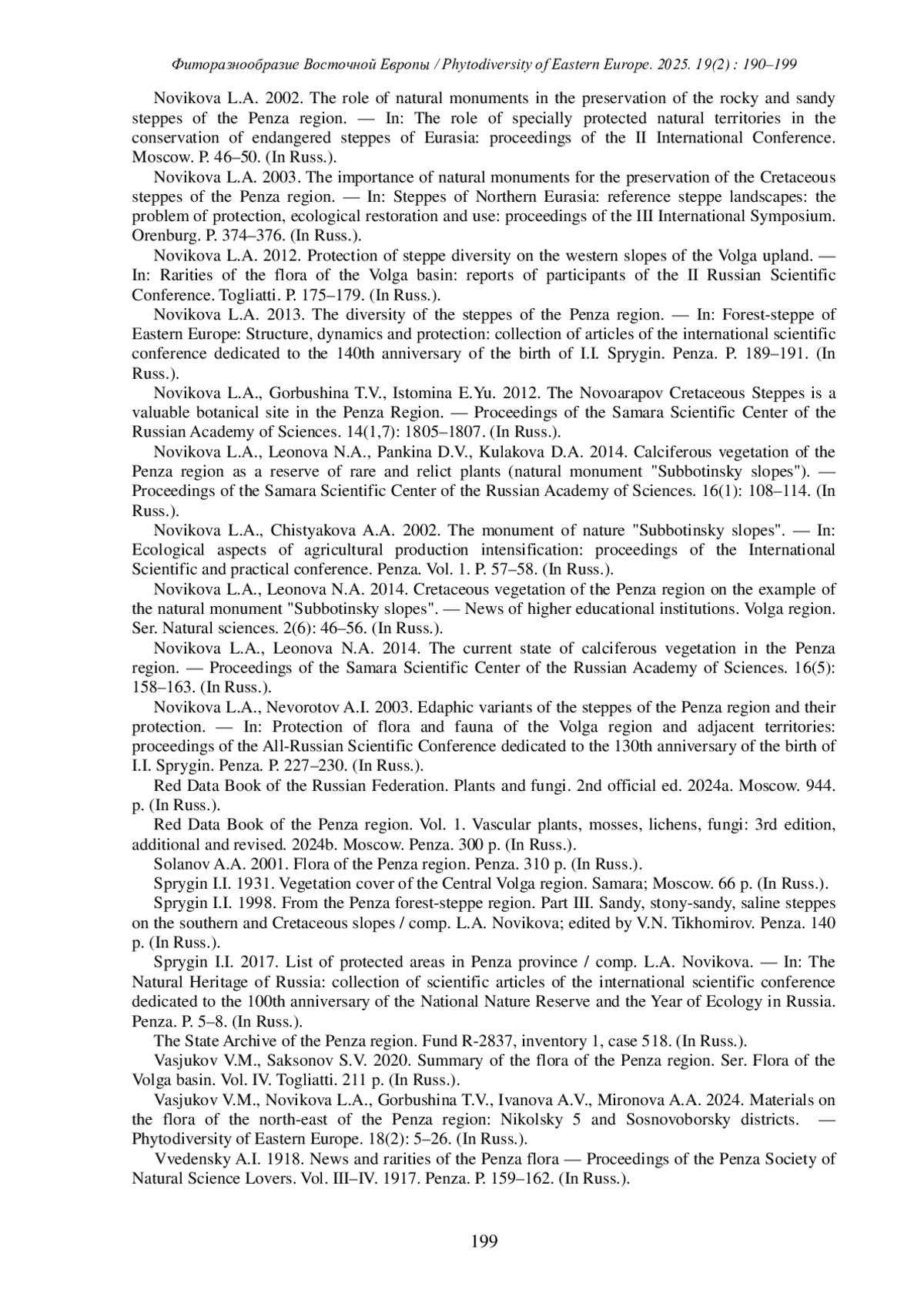 9. [Novikova et al.] Новикова Л.А., Леонова Н.А., Панькина Д.В., Кулакова Д.А. 2014. Кальцефитная растительность Пензенской области как резерват редких и реликтовых растений (памятник природы “Субботинские склоны”). - Известия Самарского научного центра РАН. 16(1): 108-114. EDN: SKYBUB