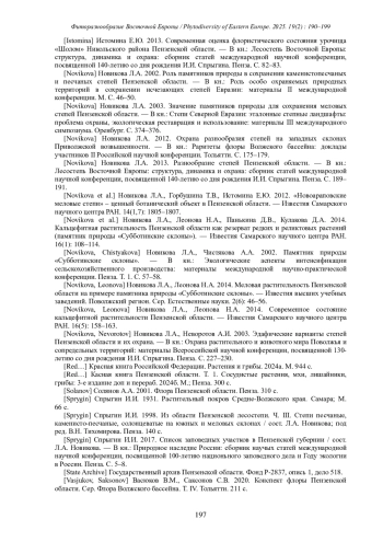 13. [Novikova, Nevorotov] Новикова Л.А., Неворотов А.И. 2003. Эдафические варианты степей Пензенской области и их охрана. - В кн.: Охрана растительного и животного мира Поволжья и сопредельных территорий: материалы Всероссийской научной конференции, посвященной 130-летию со дня рождения И.И. Спрыгина. Пенза. С. 227-230.