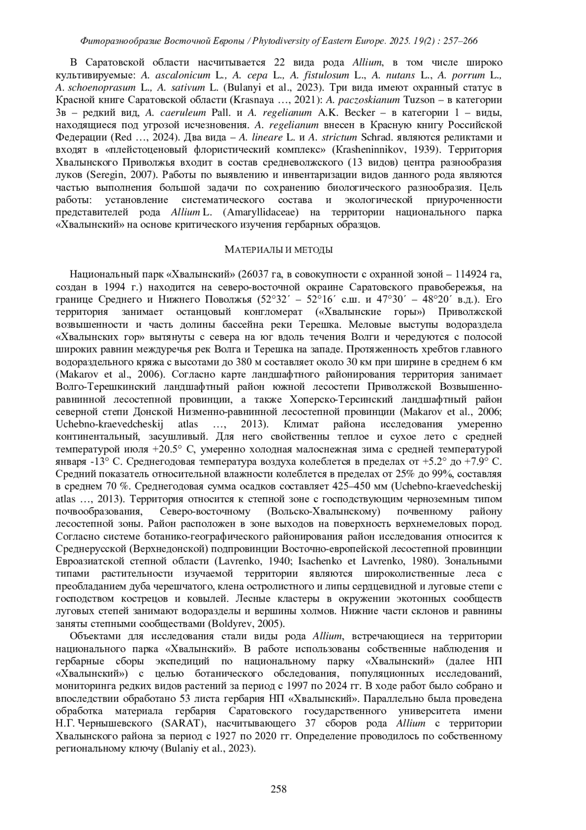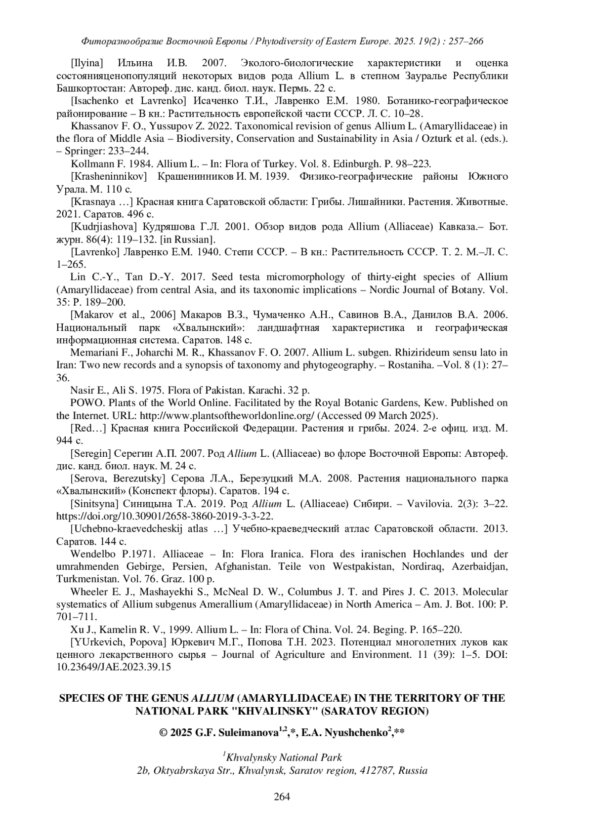 3. [Bulaniy et al.] Буланый Ю. И., Нющенко, Е. А., Солянников, В. В. 2023. Род Allium во флоре Саратовской области: ключ для определения и некоторые особенности распространения видов. - В кн.: Сборник научных статей II Всероссийской научной конференции с международным участием, посвящённой десятилетию восстановления экосистем (2020-2030). Саратов. С. 22-24.