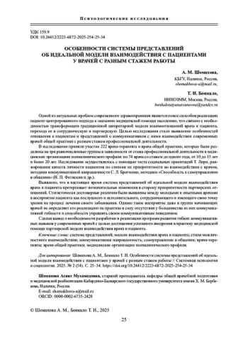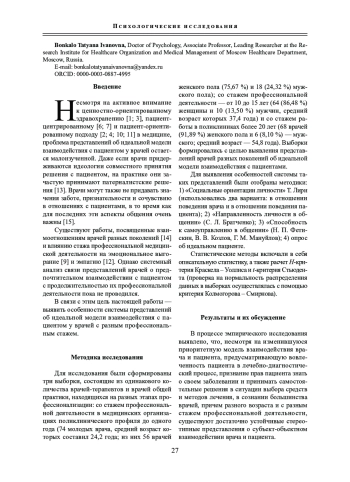 Несмотря на активное внимание к ценностно-ориентированному здравохранению [1; 3], па циентцентрированному [6; 7] и пациент-ориентированному подходу [2; 4; 10; 11] в медицине, проблема представлений об идеальной модели взаимодействия с пациентом у врачей остается малоизученной. Даже если врачи придерживаются идеологии совместного принятия решения с пациентом, на практике они зачастую принимают патерналистcкие решения [13]. Врачи могут также не придавать значения заботе, признательности и сочувствию в отношениях с пациентами, в то время как для последних эти аспекты общения очень важны [15].