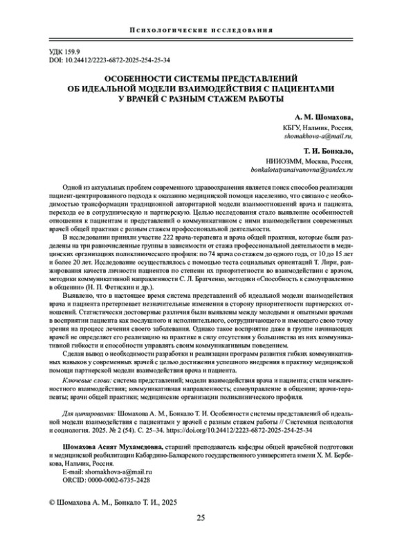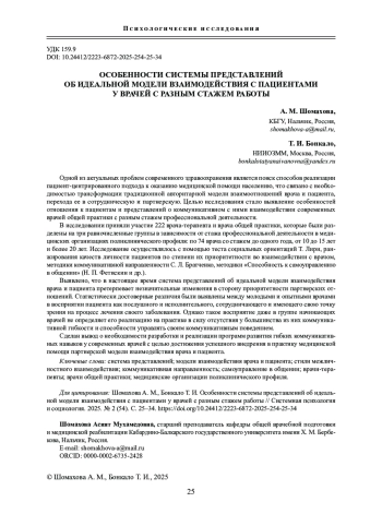 Одной из актуальных проблем современного здравоохранения является поиск способов реализации пациент-центрированного подхода к оказанию медицинской помощи населению, что связано с необходимостью трансформации традиционной авторитарной модели взаимоотношений врача и пациента, перехода ее в сотрудническую и партнерскую. Целью исследования стало выявление особенностей отношения к пациентам и представлений о коммуникативном с ними взаимодействии современных врачей общей практики с разным стажем профессиональной деятельности.