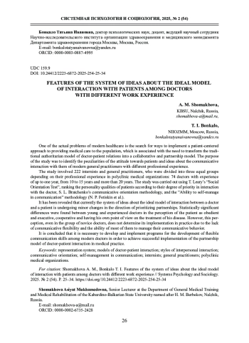 Выявлено, что в настоящее время система представлений об идеальной модели взаимодействия врача и пациента претерпевает незначительные изменения в сторону приоритетности партнерских отношений. Статистически достоверные различия были выявлены между молодыми и опытными врачами в восприятии пациента как послушного и исполнительного, сотрудничающего и имеющего свою точку зрения на процесс лечения своего заболевания. Однако такое восприятие даже в группе начинающих врачей не определяет его реализацию на практике в силу отсутствия у большинства из них коммуникативной гибкости и способности управлять своим коммуникативным поведением.