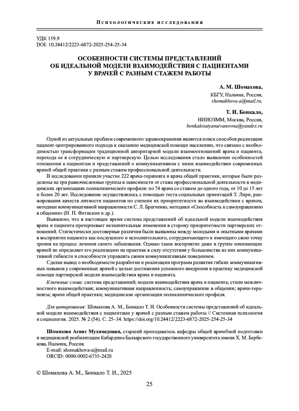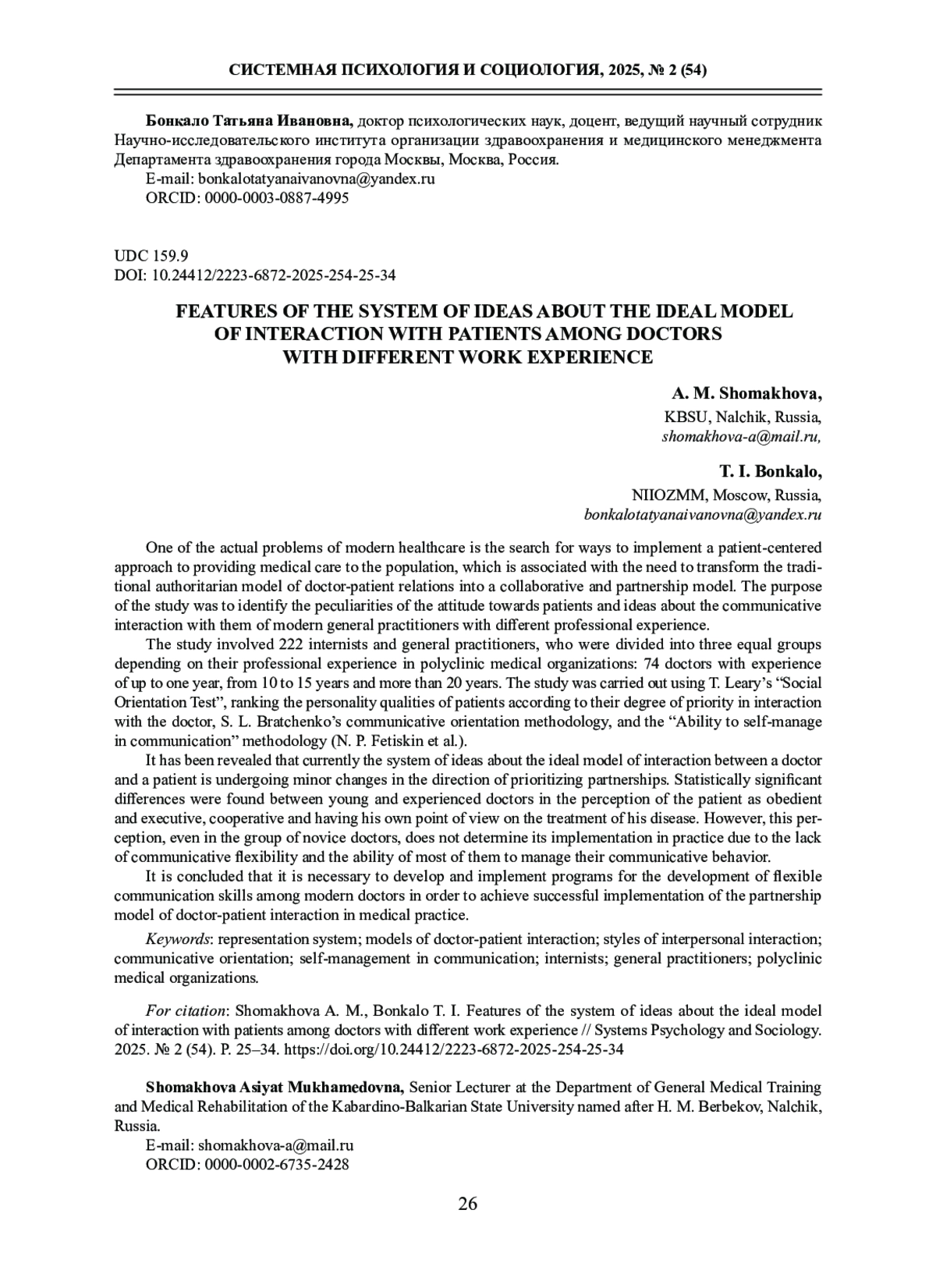 В исследовании приняли участие 222 врача-терапевта и врача общей практики, которые были разделены на три равночисленные группы в зависимости от стажа профессиональной деятельности в медицинских организациях поликлинического профиля: по 74 врача со стажем до одного года, от 10 до 15 лет и более 20 лет. Исследование осуществлялось с помощью теста социальных ориентаций Т. Лири, ранжирования качеств личности пациентов по степени их приоритетности во взаимодействии с врачом, методики коммуникативной направленности С. Л. Братченко, методики «Способность к самоуправлению в общении» (Н. П. Фетискин и др.).