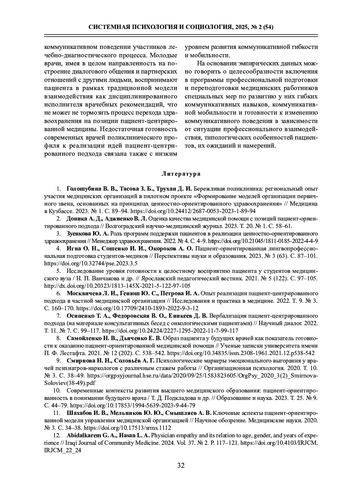 12. Abidalkarem G. A., Hasan L. A. Physician empathy and its relation to age, gender, and years of experience // Iraqi Journal of Community Medicine. 2024. Vol. 37. № 2. P. 117-121. 10.4103/IRJCM. IRJCM_22_24. DOI: 10.4103/IRJCM.IRJCM_22_24 EDN: UROFFO