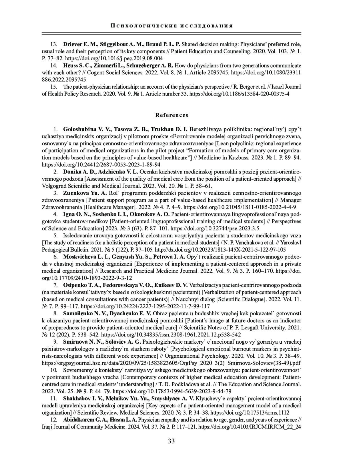 13. Driever E. M., Stiggelbout A. M., Brand P. L. P. Shared decision making: Physicians’ preferred role, usual role and their perception of its key components // Patient Education and Counseling. 2020. Vol. 103. № 1. P. 77-82. DOI: 10.1016/j.pec.2019.08.004 EDN: CXEJYB