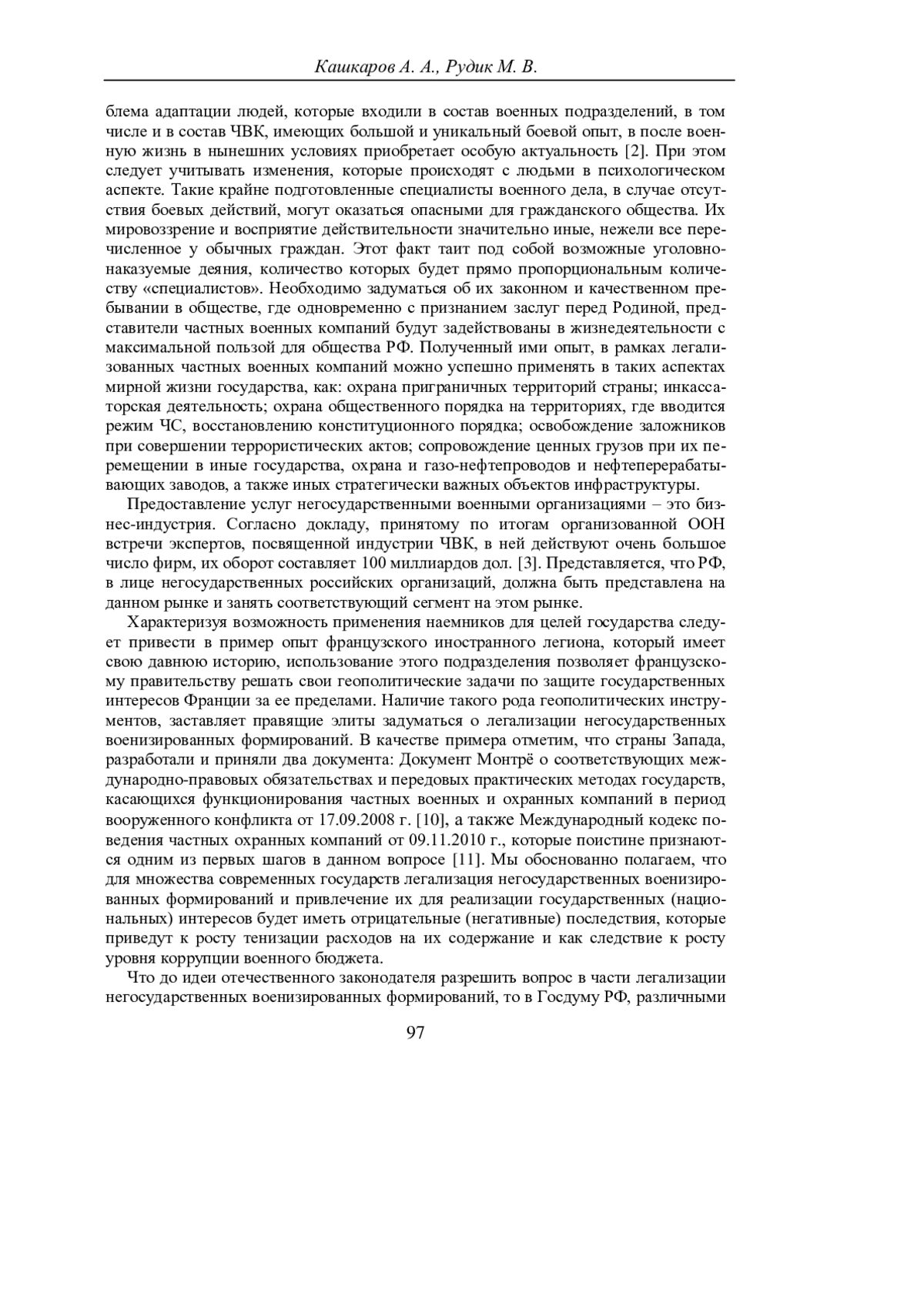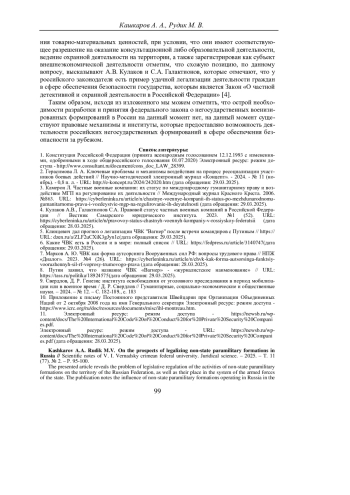 4. Кулаков А.В., Галактионов С.А. Правовой статус частных военных компаний в Российской Федерации // Вестник Самарского юридического института. 2023. №1 (52). URL: https://cyberleninka.ru/article/n/pravovoy-status-chastnyh-voennyh-kompaniy-v-rossiyskoy-federatsii (дата обращения: 28.03.2025). EDN: GTMIPF