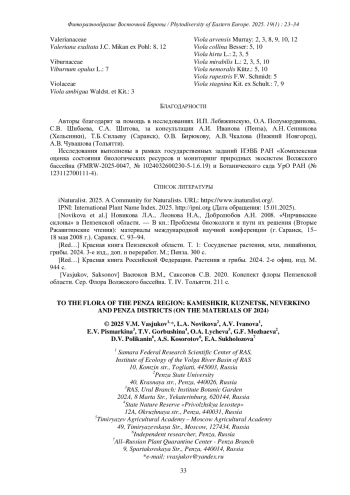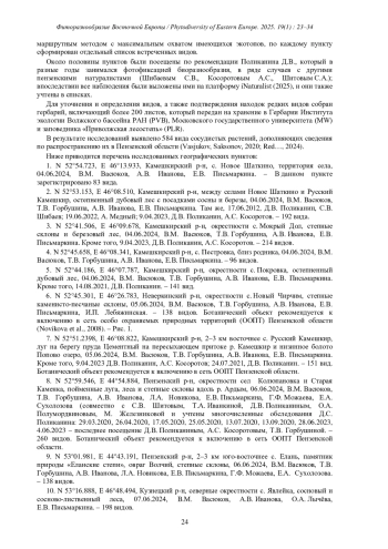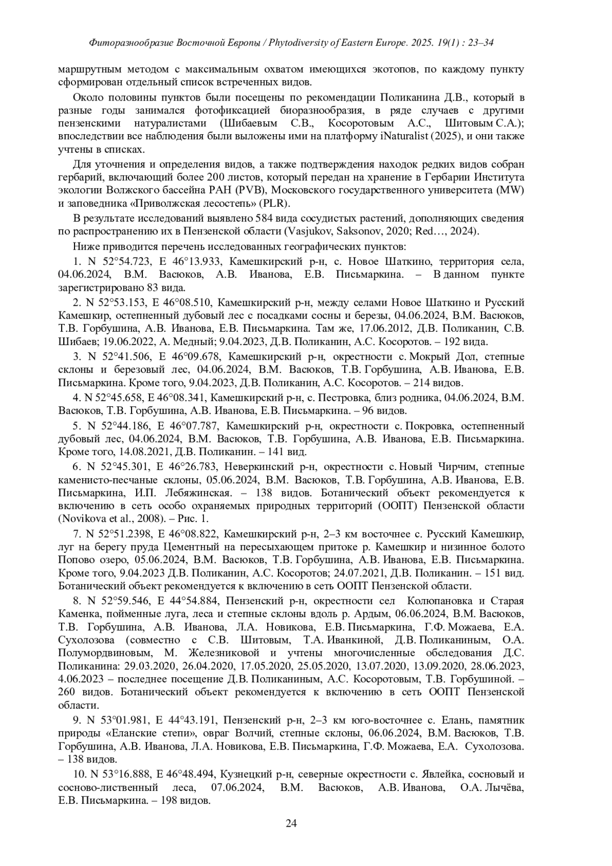 ВАСЮКОВ В. М., НОВИКОВА Л. А., ИВАНОВА А. В., ПИСЬМАРКИНА Е. В., ГОРБУШИНА Т. В., ЛЫЧЁВА О.А., МОЖАЕВА Г.Ф., ПОЛИКАНИН Д.В., КОСОРОТОВ А.С., СУХОЛОЗОВА Е.А. К ФЛОРЕ ПЕНЗЕНСКОЙ ОБЛАСТИ: КАМЕШКИРСКИЙ, КУЗНЕЦКИЙ, НЕВЕРКИНСКИЙ И ПЕНЗЕНСКИЙ РАЙОНЫ (ПО МАТЕРИАЛАМ 2024 ГОДА) // ФИТОРАЗНООБРАЗИЕ ВОСТОЧНОЙ ЕВРОПЫ. 2025. Т. 19 № 1 (17 СТ.)