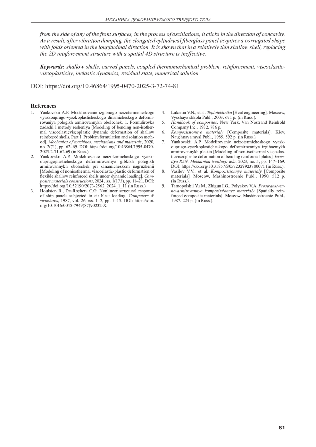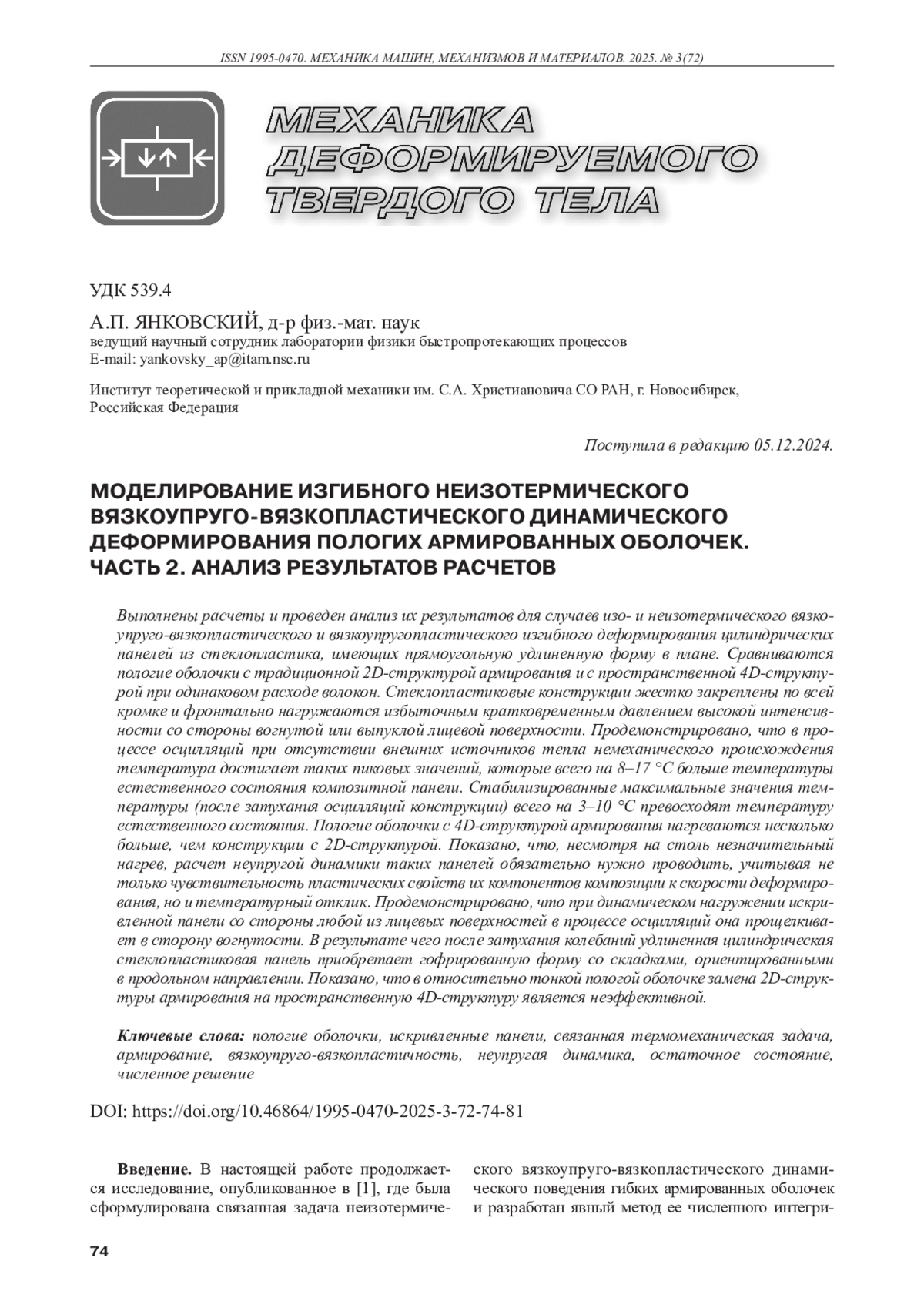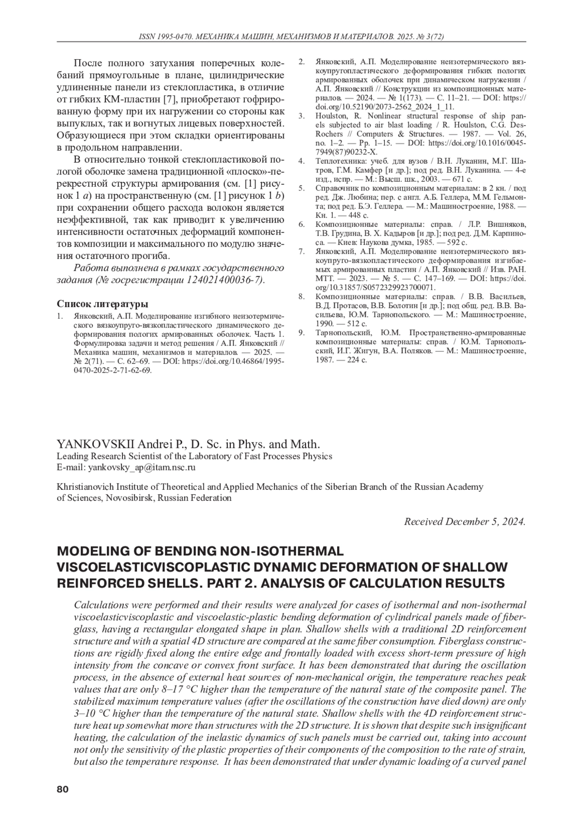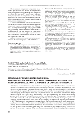 Статья: МОДЕЛИРОВАНИЕ ИЗГИБНОГО НЕИЗОТЕРМИЧЕСКОГО ВЯЗКОУПРУГО-ВЯЗКОПЛАСТИЧЕСКОГО ДИНАМИЧЕСКОГО ДЕФОРМИРОВАНИЯ ПОЛОГИХ АРМИРОВАННЫХ ОБОЛОЧЕК. ЧАСТЬ 2. АНАЛИЗ РЕЗУЛЬТАТОВ РАСЧЕТОВ (2025)