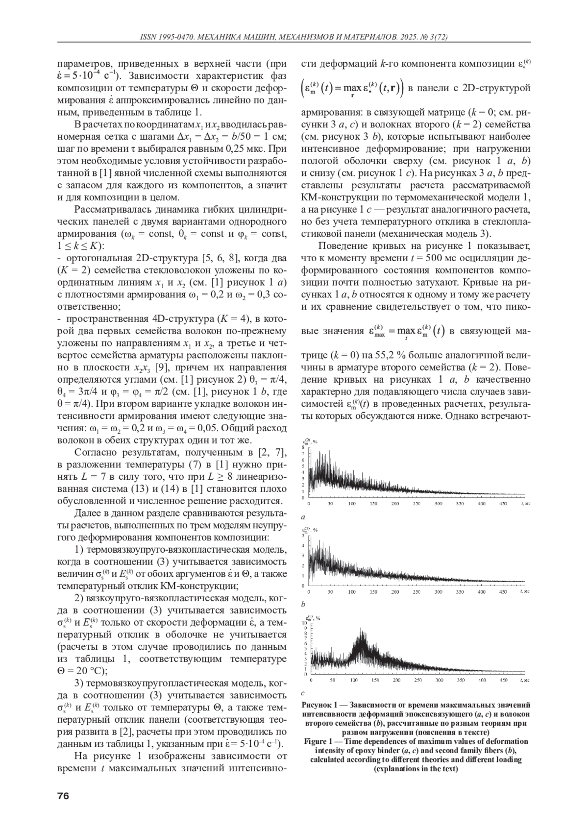 ЯНКОВСКИЙ А. П. МОДЕЛИРОВАНИЕ ИЗГИБНОГО НЕИЗОТЕРМИЧЕСКОГО ВЯЗКОУПРУГО-ВЯЗКОПЛАСТИЧЕСКОГО ДИНАМИЧЕСКОГО ДЕФОРМИРОВАНИЯ ПОЛОГИХ АРМИРОВАННЫХ ОБОЛОЧЕК. ЧАСТЬ 2. АНАЛИЗ РЕЗУЛЬТАТОВ РАСЧЕТОВ // МЕХАНИКА МАШИН, МЕХАНИЗМОВ И МАТЕРИАЛОВ. 2025. № 3 (72)