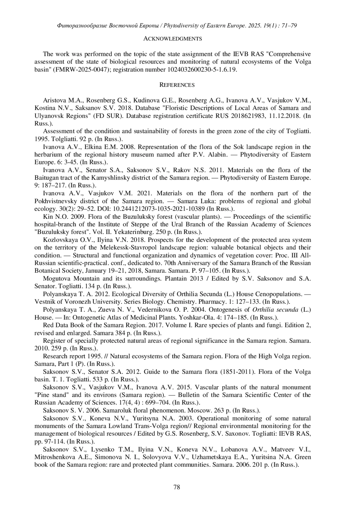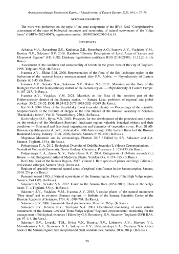 2. [Ivanova et al.] Иванова А.В., Сенатор С.А., Саксонов С.В., Раков Н.С. 2011. Материалы к флоре урочища Байтуган Камышлинского района Самарской области // Фиторазнообразие Восточной Европы. 9: 187-217. EDN: RXAHNJ