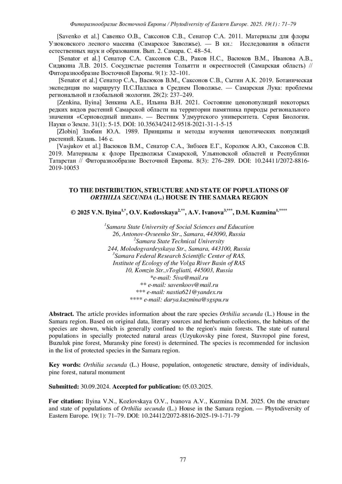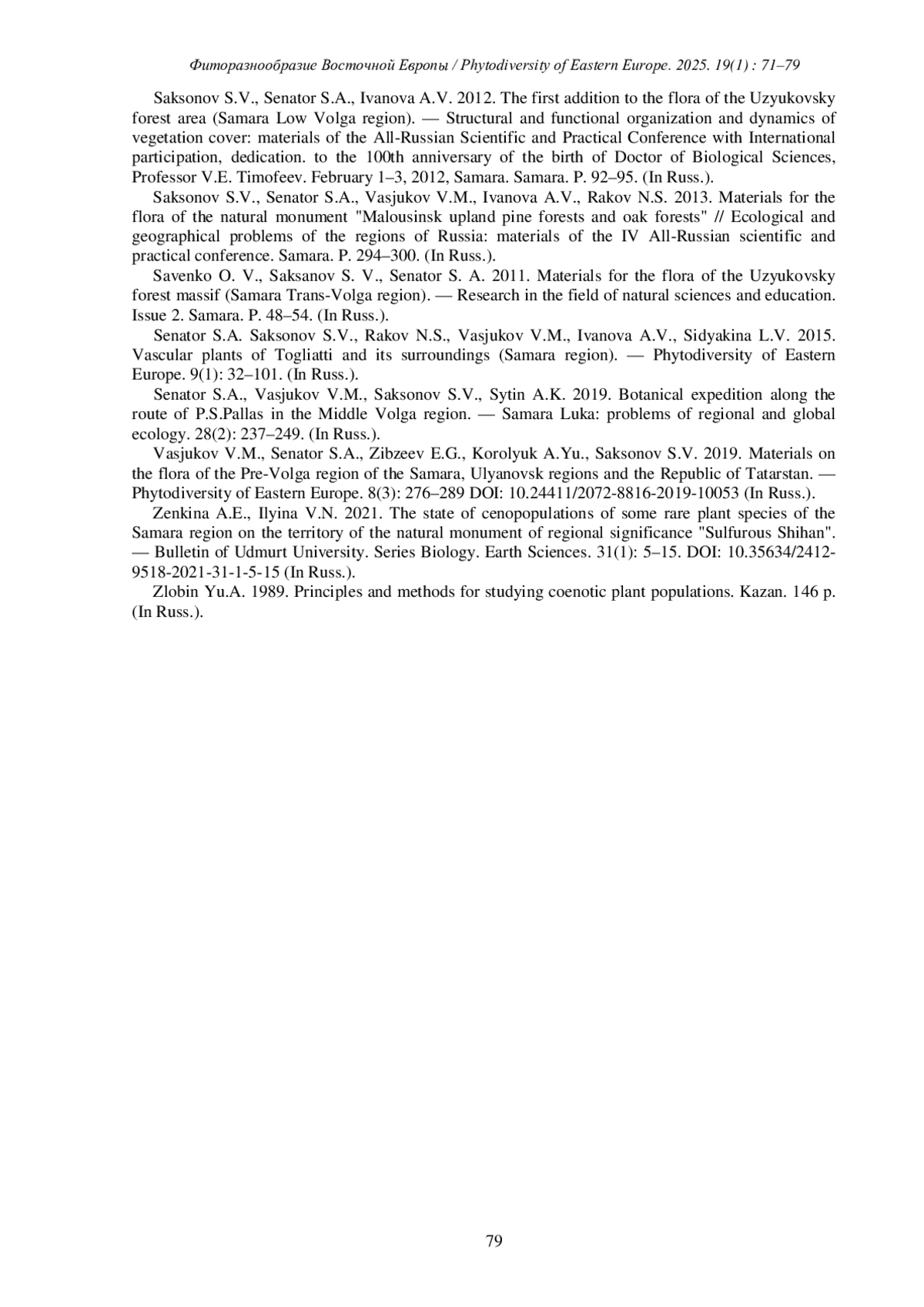 24. [Zenkina, Ilyina] Зенкина Т.Е., Ильина В.Н. 2021. Состояние ценопопуляций некоторых редких видов растений Самарской области на территории памятника природы регионального значения “Серноводный шихан”. - Вестник Удмуртского университета. Серия Биология. Науки о Земле. 31(1): 5-15. DOI: 10.35634/2412-9518-2021-31-1-5-15 EDN: SYVCKS