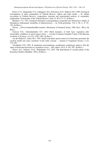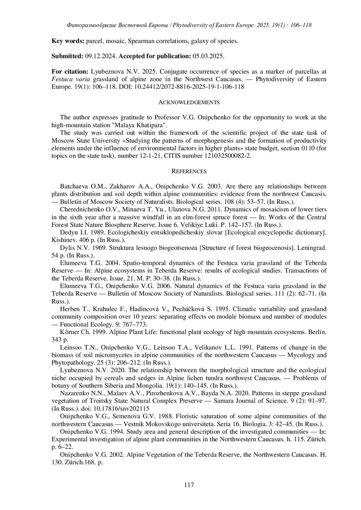 6. [Elumeeva, Onipchenko] Елумеева Т.Г., Онипченко В.Г. 2006. Естественная разногодичная динамика пестроовсяницевого луга Тебердинского заповедника - Бюллетень Московского общества испытателей природы. Отдел биологический. 111 (2): 62-71. EDN: HTEMKR