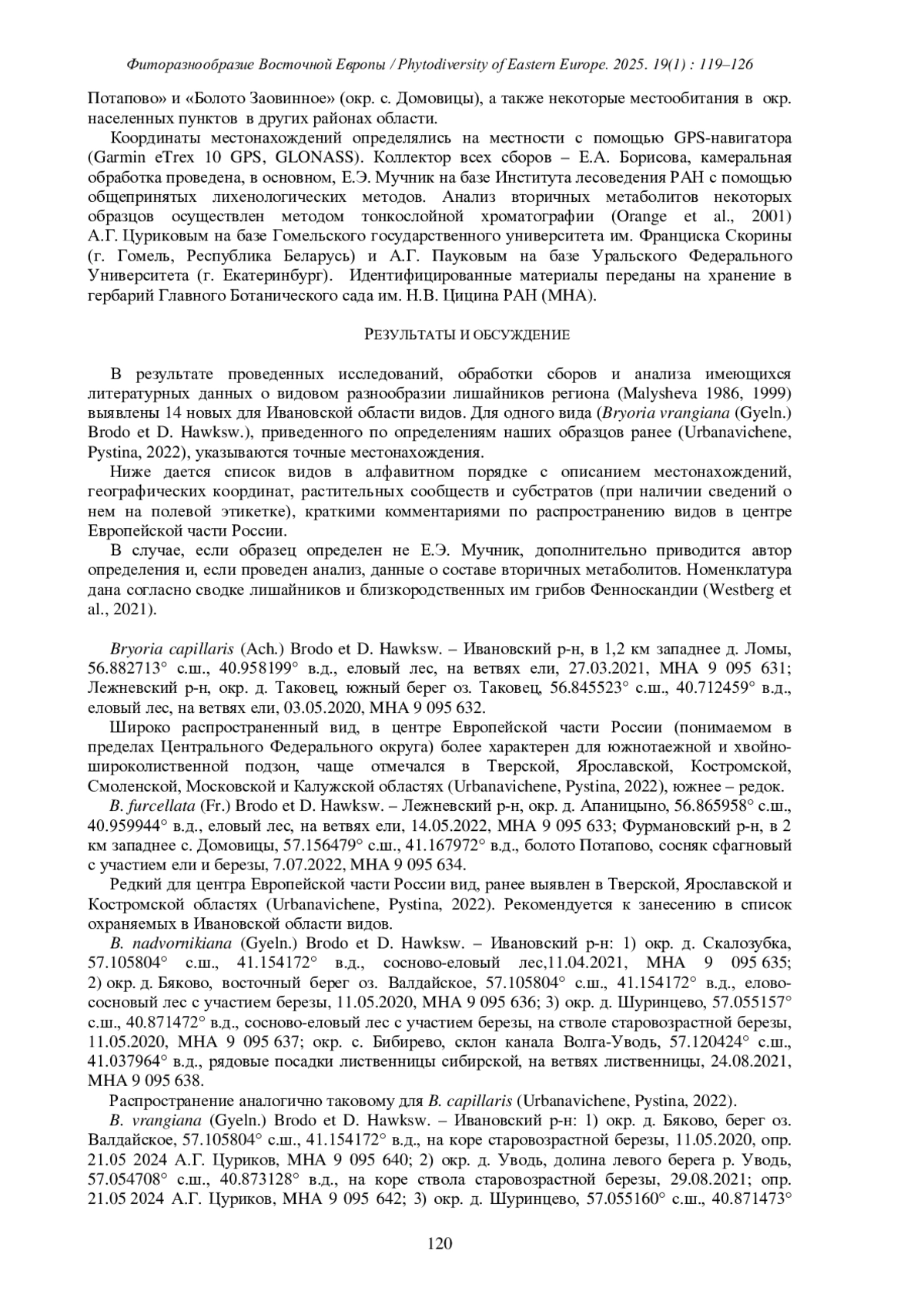 МУЧНИК Е. Э., БОРИСОВА Е. А. НОВЫЕ ВИДЫ ЛИШАЙНИКОВ ИВАНОВСКОЙ ОБЛАСТИ // ФИТОРАЗНООБРАЗИЕ ВОСТОЧНОЙ ЕВРОПЫ. 2025. Т. 19 № 1 (17 СТ.)