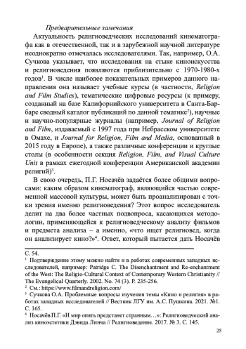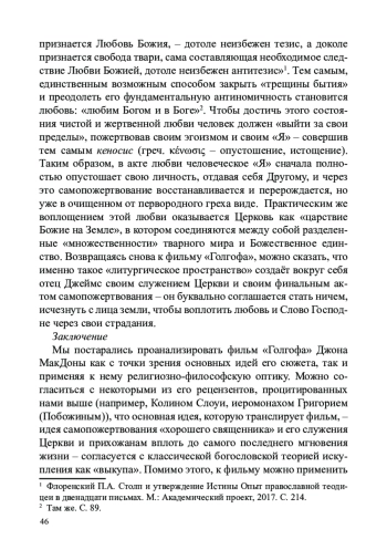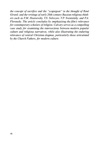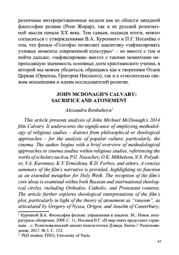 В статье предпринимается попытка религиоведческого анализа фильма Джона МакДоны «Голгофа» (2014). Показывается важность такого рода исследований, проведённых с применением к произведениям кинематографа (и популярной культуры в целом) методологии религиоведческих исследований (в отличие от философской и теологической методологии). Во введении автор статьи делает краткий обзор подходов к исследованию фильмов с точки зрения религиоведческой методологии, представленный в работах П. Г. Носачева, О. К. Михельсон, Н. С. Полякова, В. А. Куренного, К. В. Ермишиной, Б. Д. Форбса и др. Далее автор производит разбор сюжета фильма «Голгофа» (представляющего собой одну большую метафору на страстную неделю) и анализирует русскую и зарубежную рецепцию основных идей фильма в теологических (православных и католическо-протестантских, соответственно) кругах. По аналогичному принципу рассматриваются различные интерпретации сюжета данного фильма в богословском и философском контексте: в связи с теорией искупления как «выкупа» Григория Нисского, Оригена и Ансельма Кентерберийского; в связи с концепцией жертвенности и «козла отпущения» Рене Жирара, а также в доктринах русских религиозных мыслителей начала XX века - Ф. М. Достоевского, В. С. Соловьева, В. П. Свенцицкого и П. А. Флоренского. Делается общий вывод об универсальности фильма «Голгофа» для современных исследователей религии, так как на его примере можно как изучать основные моменты перекрестков современной популярной культуры и религиозных нарративов, так и утверждать непреходящую актуальность для современной культуры универсальных догм христианского учения.