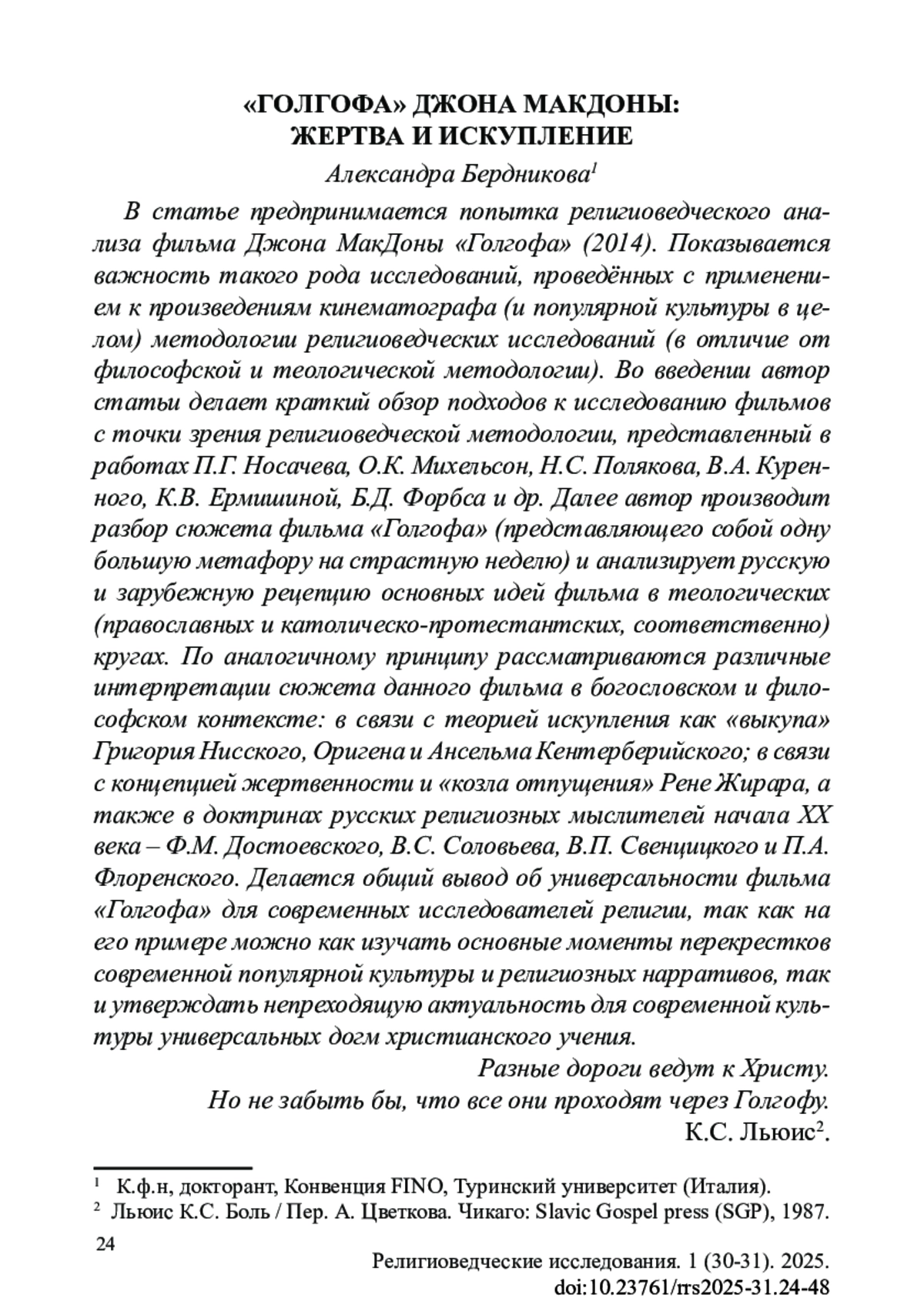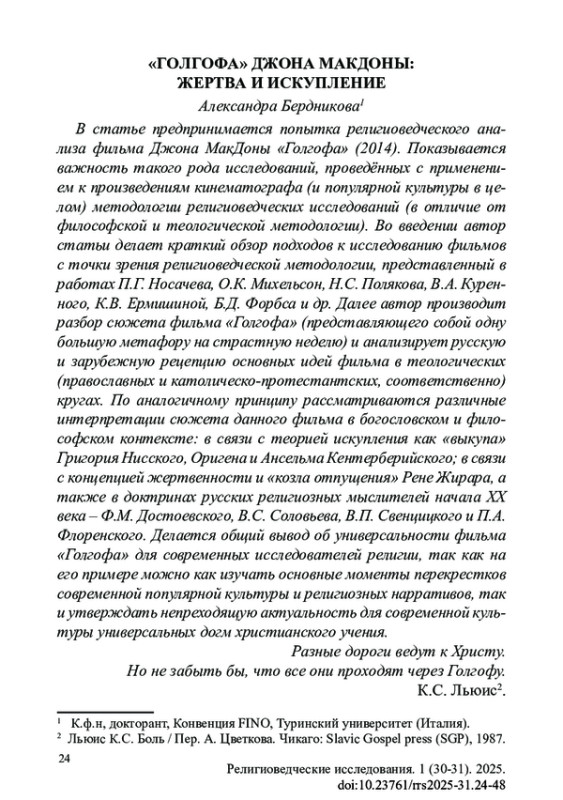 БЕРДНИКОВА А. «ГОЛГОФА» ДЖОНА МАКДОНЫ: ЖЕРТВА И ИСКУПЛЕНИЕ // РЕЛИГИОВЕДЧЕСКИЕ ИССЛЕДОВАНИЯ. 2025. № 1 (30-31)