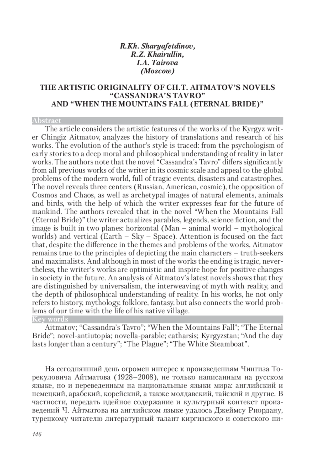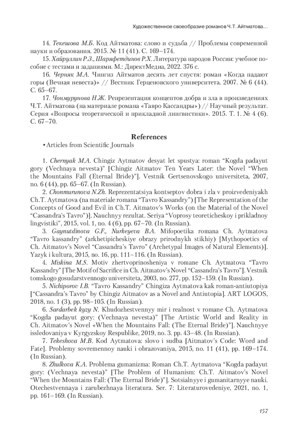 Статья: ХУДОЖЕСТВЕННОЕ СВОЕОБРАЗИЕ РОМАНОВ Ч. Т. АЙТМАТОВА "ТАВРО КАССАНДРЫ" И "КОГДА ПАДАЮТ ГОРЫ (ВЕЧНАЯ НЕВЕСТА)" (2023)