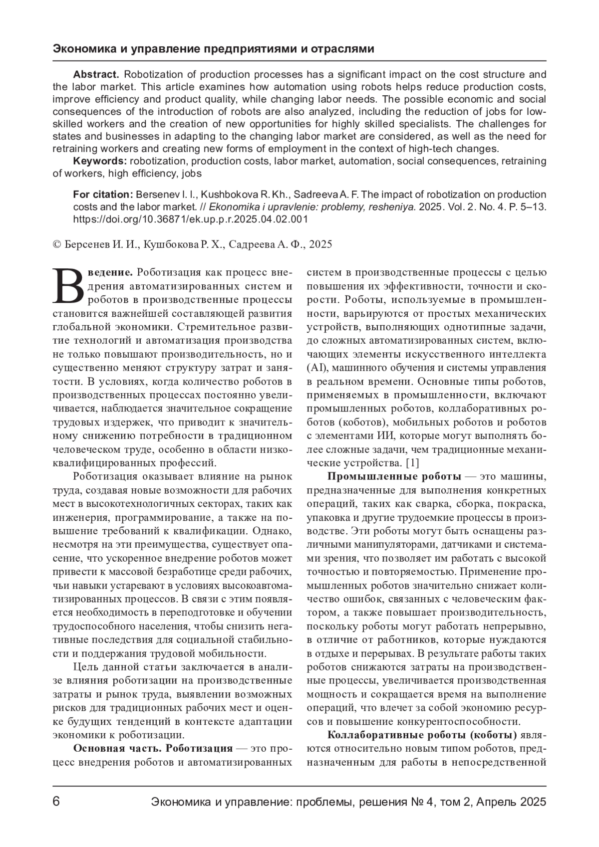 Роботизация производственных процессов оказывает значительное влияние на структуру затрат и рынок труда. В данной статье рассматривается, как автоматизация с использованием роботов способствует сокращению производственных затрат, повышению эффективности и качества продукции, одновременно изменяя потребности в рабочей силе. Также анализируются возможные экономические и социальные последствия внедрения роботов, включая снижение рабочих мест для низкоквалифицированных работников и создание новых возможностей для высококвалифицированных специалистов. Рассмотрены вызовы для государств и бизнеса в адаптации к изменяющемуся рынку труда, а также необходимость в переподготовке работников и создании новых форм занятости в условиях высокотехнологичных изменений.