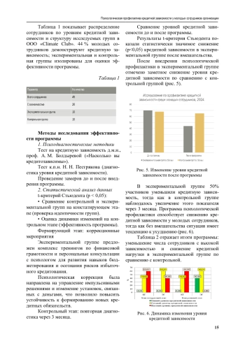 Выводы. Нами были разработаны рекомендации для компаний по внедрению регуляр-ных тренингов по управлению финансами и финансовой грамотности, созданию «финансовых кураторов» и службы психологической поддержки для сотрудников. Исследование показало эффективность психопрофилактики кредитной зависимости. Гипотеза доказана, в дальнейшем рекомендуется шире внедрять такие программы. Следующий перспективный этап исследования — разработка мобильного приложения для самоконтроля расходов.