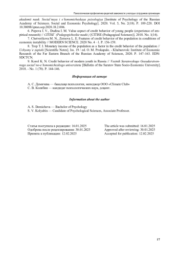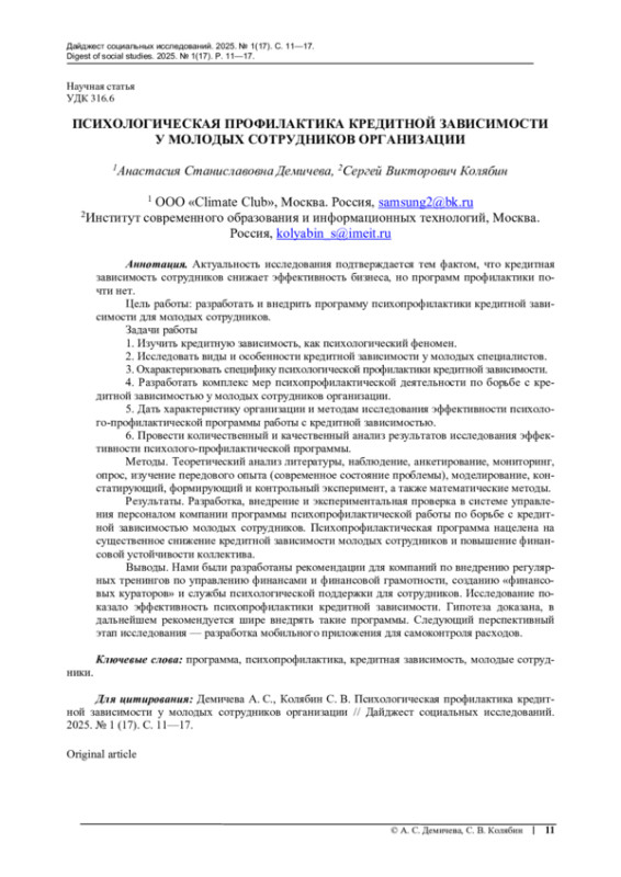 ДЕМИЧЕВА А. С., КОЛЯБИН С. В. ПСИХОЛОГИЧЕСКАЯ ПРОФИЛАКТИКА КРЕДИТНОЙ ЗАВИСИМОСТИ У МОЛОДЫХ СОТРУДНИКОВ ОРГАНИЗАЦИИ // ДАЙДЖЕСТ СОЦИАЛЬНЫХ ИССЛЕДОВАНИЙ. 2025. № 1 (17)