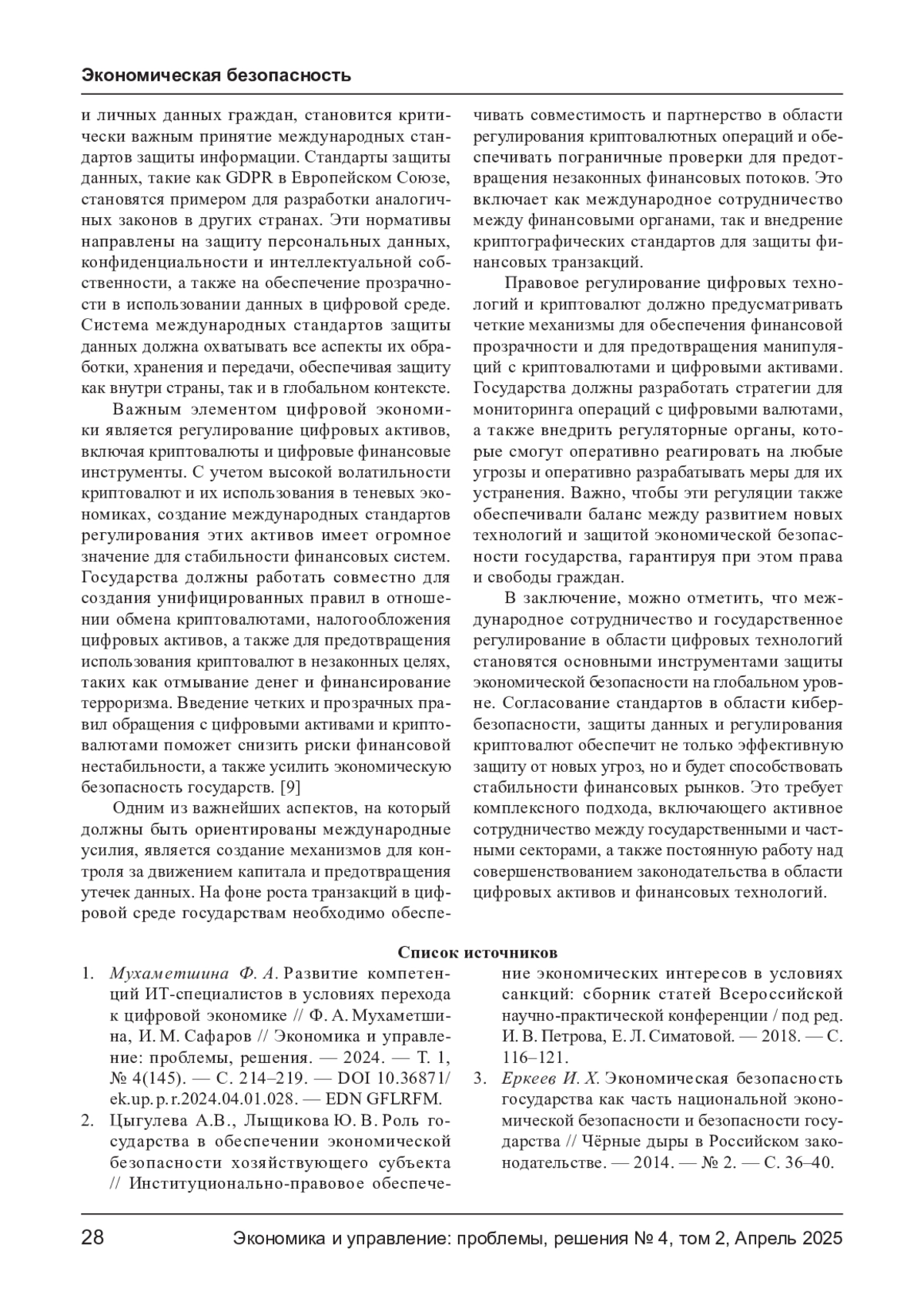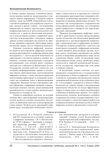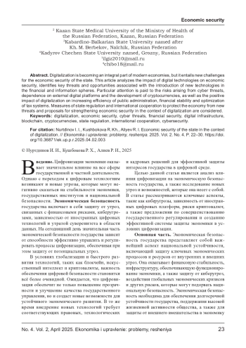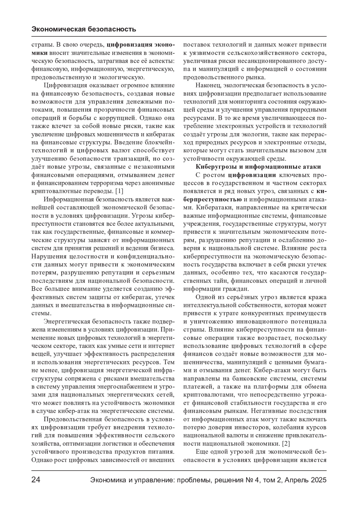 Цифровизация становится неотъемлемой частью современных экономик, однако она влечет за собой новые вызовы для экономической безопасности государства. В данной статье анализируется влияние цифровых технологий на экономическую безопасность, выявляются ключевые угрозы и возможности, связанные с внедрением новых технологий в финансовую и информационную сферы. Особое внимание уделяется рискам, возникающим от киберугроз, зависимостью от внешних цифровых платформ и развитию криптовалют, а также положительному влиянию цифровизации на повышение эффективности государственного управления, финансовой стабильности и оптимизации налоговых систем. Рассматриваются меры государственного регулирования и международного сотрудничества для защиты экономики от новых угроз и предложения по укреплению экономической безопасности в условиях цифровизации.