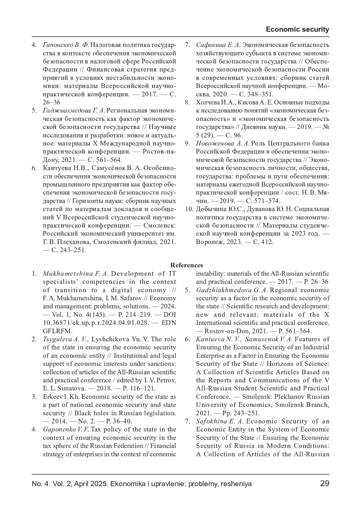 7. Сафохина Е. А. Экономическая безопасность хозяйствующего субъекта в системе экономической безопасности государства // Обеспечение экономической безопасности России в современных условиях: сборник статей Всероссийской научной конференции. - Москва, 2020. - С. 348-351. EDN: YAMYGS
