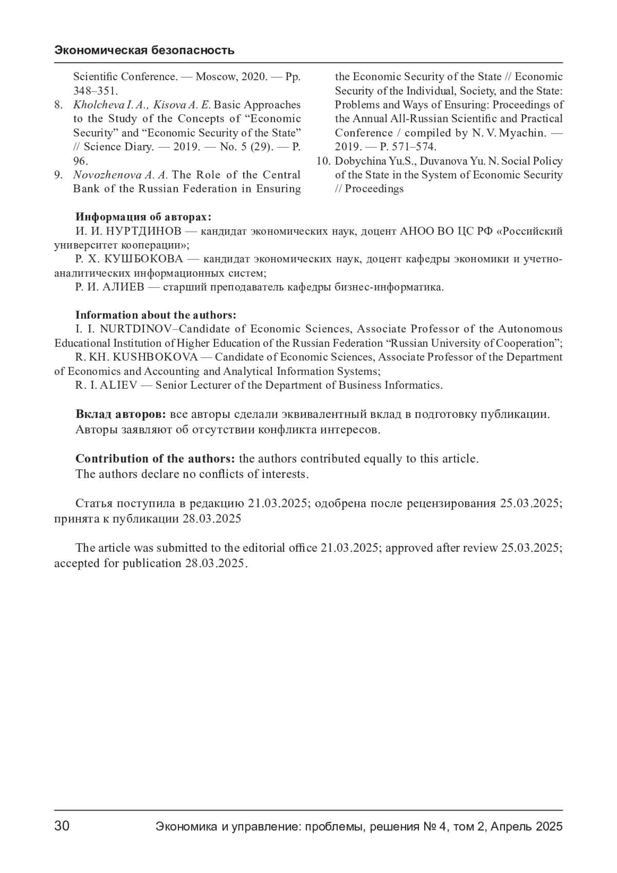 9. Новоженова А. А. Роль Центрального банка Российской Федерации в обеспечении экономической безопасности государства // Экономическая безопасность личности, общества, государства: проблемы и пути обеспечения: материалы ежегодной Всероссийской научно- практической конференции / сост. Н. В. Мячин. - 2019. - С. 571-574. EDN: OACTPW