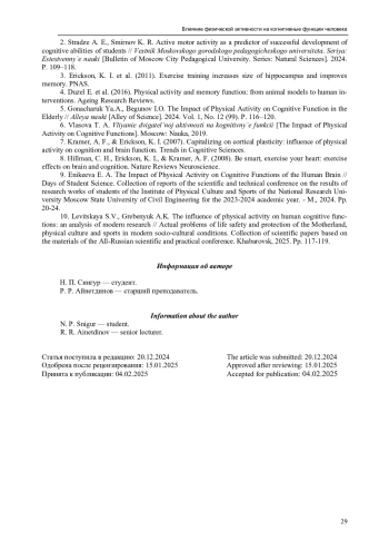 9. Еникеева Э. А. Влияние физической активности на когнитивные функции мозга у человека // Дни студенческой науки: сборник докладов научно-технической конференции по итогам научно-исследовательских работ студентов института физической культуры и спорта НИУ МГСУ за 2023-2024 учебный год. М., 2024. С. 20-24.