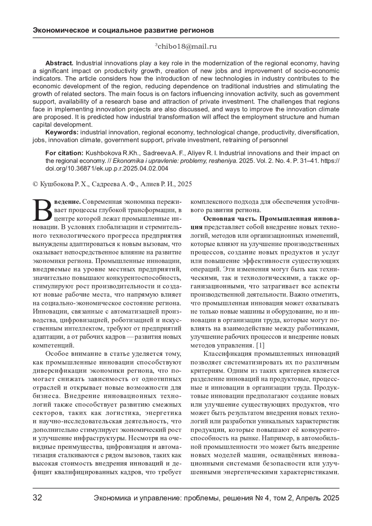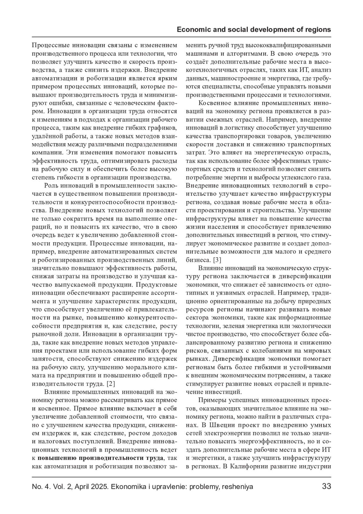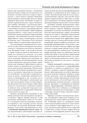 Промышленные инновации играют ключевую роль в модернизации экономики региона, оказывая существенное влияние на рост производительности, создание новых рабочих мест и улучшение социально- экономических показателей. В статье рассматривается, как внедрение новых технологий в промышленности способствует экономическому развитию региона, снижению зависимости от традиционных отраслей и стимулированию роста смежных секторов. Основное внимание уделено факторам, влияющим на инновационную активность, таким как государственная поддержка, наличие научно- исследовательской базы и привлечения частных инвестиций. Также обсуждаются вызовы, с которыми сталкиваются регионы при реализации инновационных проектов, и предлагаются пути для улучшения инновационного климата. Прогнозируется, как промышленная трансформация повлияет на структуру занятости и развитие человеческого капитала.