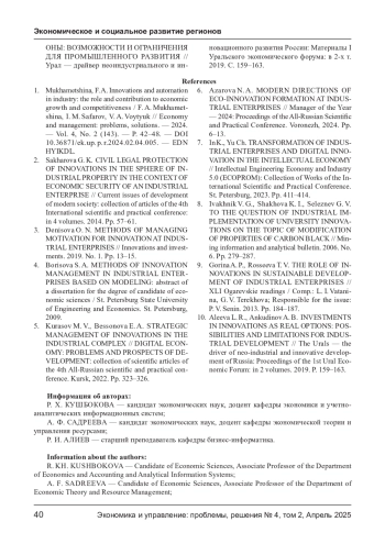 1. Мухаметшина, Ф. А. Инновации и автоматизация в промышленности: роль и вклад в экономический рост и конкурентоспособность / Ф. А. Мухаметшина, И. М. Сафаров, В. А. Войтюк // Экономика и управление: проблемы, решения. - 2024. - Т. 4, № 2(143). - С. 42-48. DOI: 10.36871/ek.up.p.r.2024.02.04.005 EDN: HYIKDL