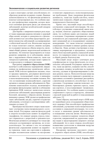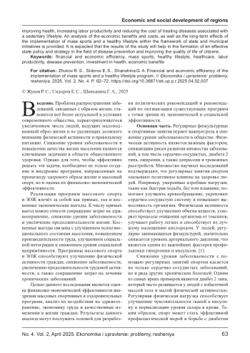 Внедрение программ массового спорта и здорового образа жизни (ЗОЖ) является важным шагом в улучшении здоровья населения и снижении финансовых затрат на здравоохранение. В данной статье рассматривается финансово- экономическая эффективность реализации таких программ, в том числе через их влияние на улучшение здоровья, повышение производительности труда и снижение затрат на лечение заболеваний, связанных с малоподвижным образом жизни. Приводится анализ экономических выгод и затрат, а также долгосрочных эффектов от внедрения массового спорта и ЗОЖ в рамках государственных и муниципальных инициатив. Ожидается, что результаты исследования помогут в формировании эффективной государственной политики и стратегии в области профилактики заболеваний и повышения качества жизни граждан.