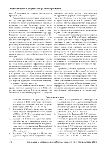 4. Воронцова Е.В., Потапчук А. А. Пропаганда здорового образа жизни посредством спортивных и оздоровительных мероприятий в медицинских вузах // Актуальные проблемы физической культуры студентов медицинских вузов: материалы IX Всероссийской научно-практической конференции с международным участием. СПб., 2024. С. 102-104. EDN: FUXSZU
