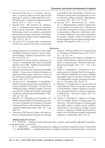5. Ермилова В.В., Турянская В. А. Формирование привычки к ЗОЖ у населения как фактор устойчивого развития физической культуры и спорта в Российской Федерации // Успехи гуманитарных наук. 2024. № 9. С. 109-114.