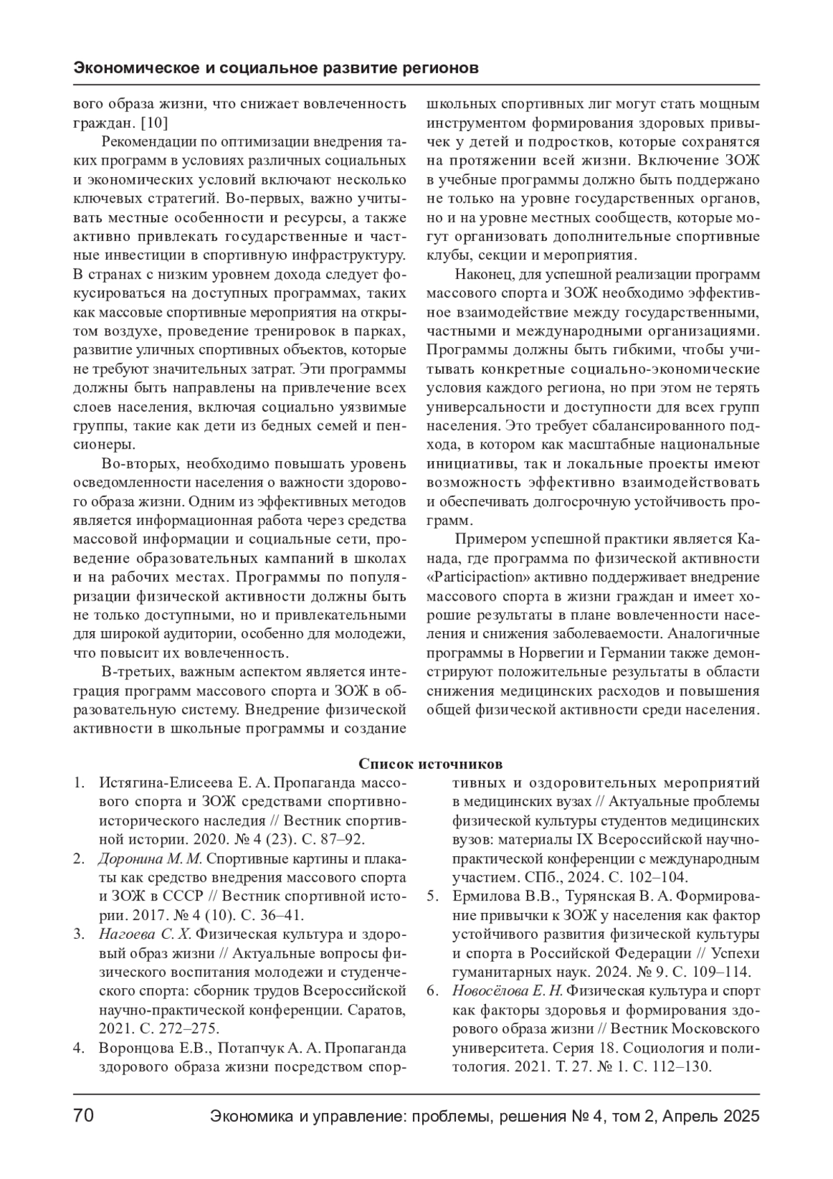 6. Новосёлова Е. Н. Физическая культура и спорт как факторы здоровья и формирования здорового образа жизни // Вестник Московского университета. Серия 18. Социология и политология. 2021. Т. 27. № 1. С. 112-130. EDN: XRZEME