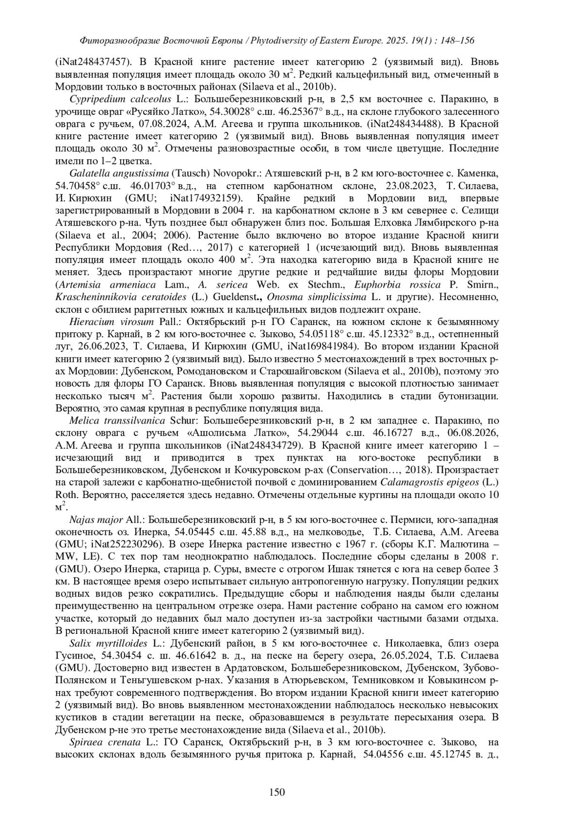 19. [Silaeva et al.] Силаева Т.Б., Кирюхин И.В., Чугунов Г.Г., Левин В.К., Майоров С.Р., Письмаркина Е.В., Агеева А.М., Варгот Е.В. 2010b. Сосудистые растения Республики Мордовия (конспект флоры). Саранск. 352 с. [Silaeva et al.] Силаева Т.Б., Варгот Е.В., Хапугин А.А., Чугунов Г.Г., Агеева А.М., Большаков С.Ю., Ивойлов А.В., Гришуткин О.Г., Кирюхин И.В. 2011. Редкие растения и грибы: материалы для ведения Красной книги Республики Мордовия за 2011 год. Саранск. 60 c.
