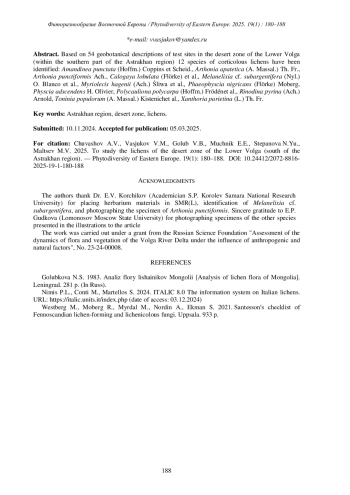 На 54 геоботанических описаниях пробных площадок пустынной зоны Нижней Волги (в пределах южной части Астраханской области) выявлено 12 видов эпифитных лишайников: Amandinea punctata (Hoffm.) Coppins et Scheid., Arthonia apatetica (A. Massal.) Th. Fr., Arthonia punctiformis Ach., Calogaya lobulata (Flörke) Arupet al., Melanelixia cf. subargentifera (Nyl.) O. Blanco et al., Myriolecis hagenii (Ach.) Śliwa et al., Phaeophyscia nigricans (Flörke) Moberg, Physcia adscendens H. Olivier, Polycauliona polycarpa (Hoffm.) Frödénet al., Rinodina pyrina (Ach.) Arnold, Toninia populorum (A. Massal.) Kistenichet al., Xanthoria parietina (L.) Th. Fr.