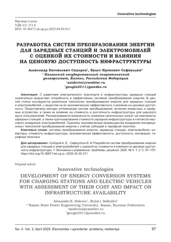 С развитием электрического транспорта и инфраструктуры зарядных станций значительно возрастает потребность в эффективных системах преобразования энергии. В данной статье исследуются различные технологии преобразования энергии для зарядных станций и электромобилей, с акцентом на их экономическую эффективность и влияние на ценовую доступность. Представлены методы оптимизации систем преобразования, включая инверторы и зарядные устройства, а также их влияние на стоимость и доступность инфраструктуры для широкого круга пользователей. Рассматривается возможность снижения капитальных затрат на компоненты зарядных станций, а также прогнозирование стоимости зарядной инфраструктуры в контексте массового внедрения электромобилей. Оценены экономические преимущества внедрения инновационных технологий преобразования энергии с учётом субсидий и тарифной политики.